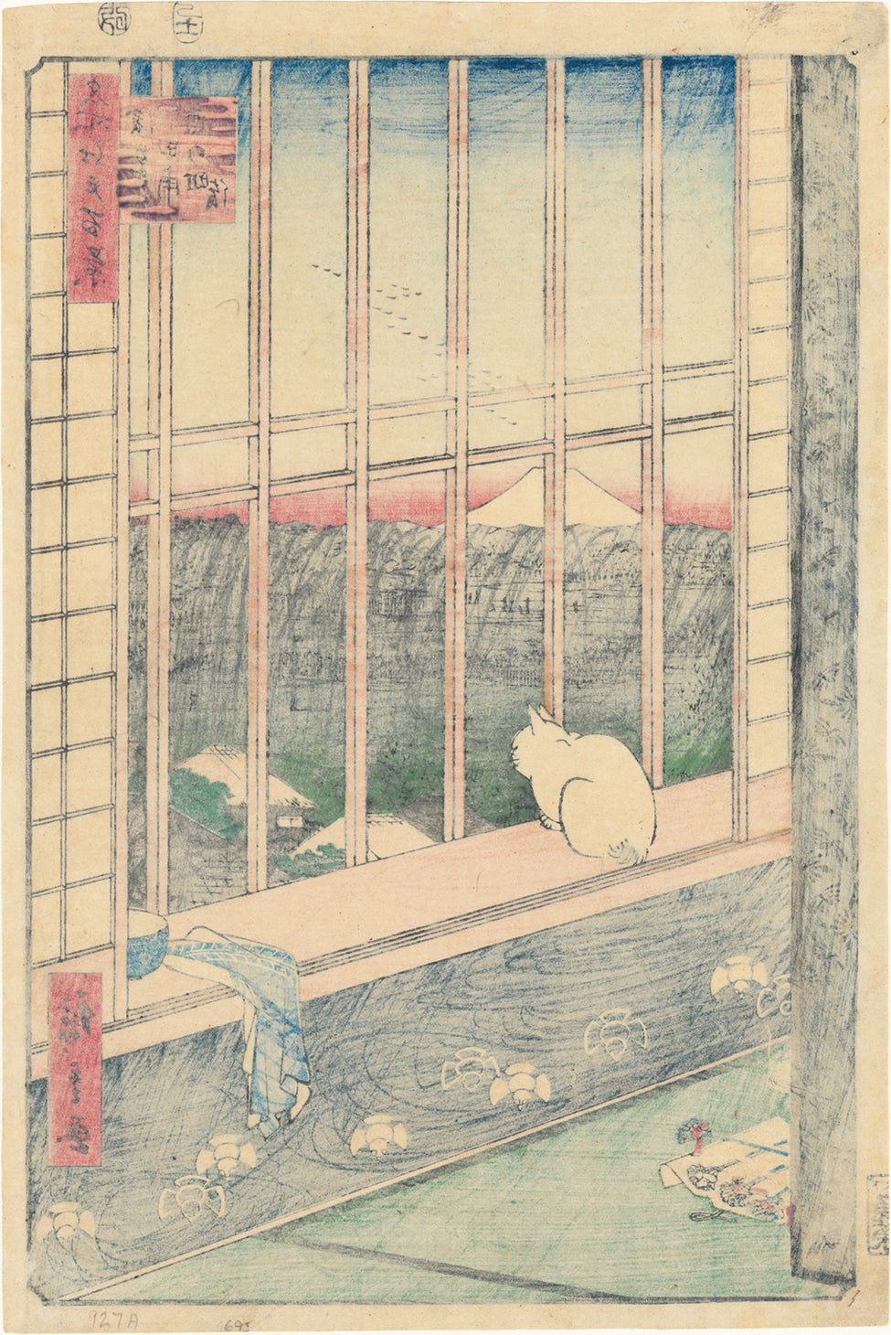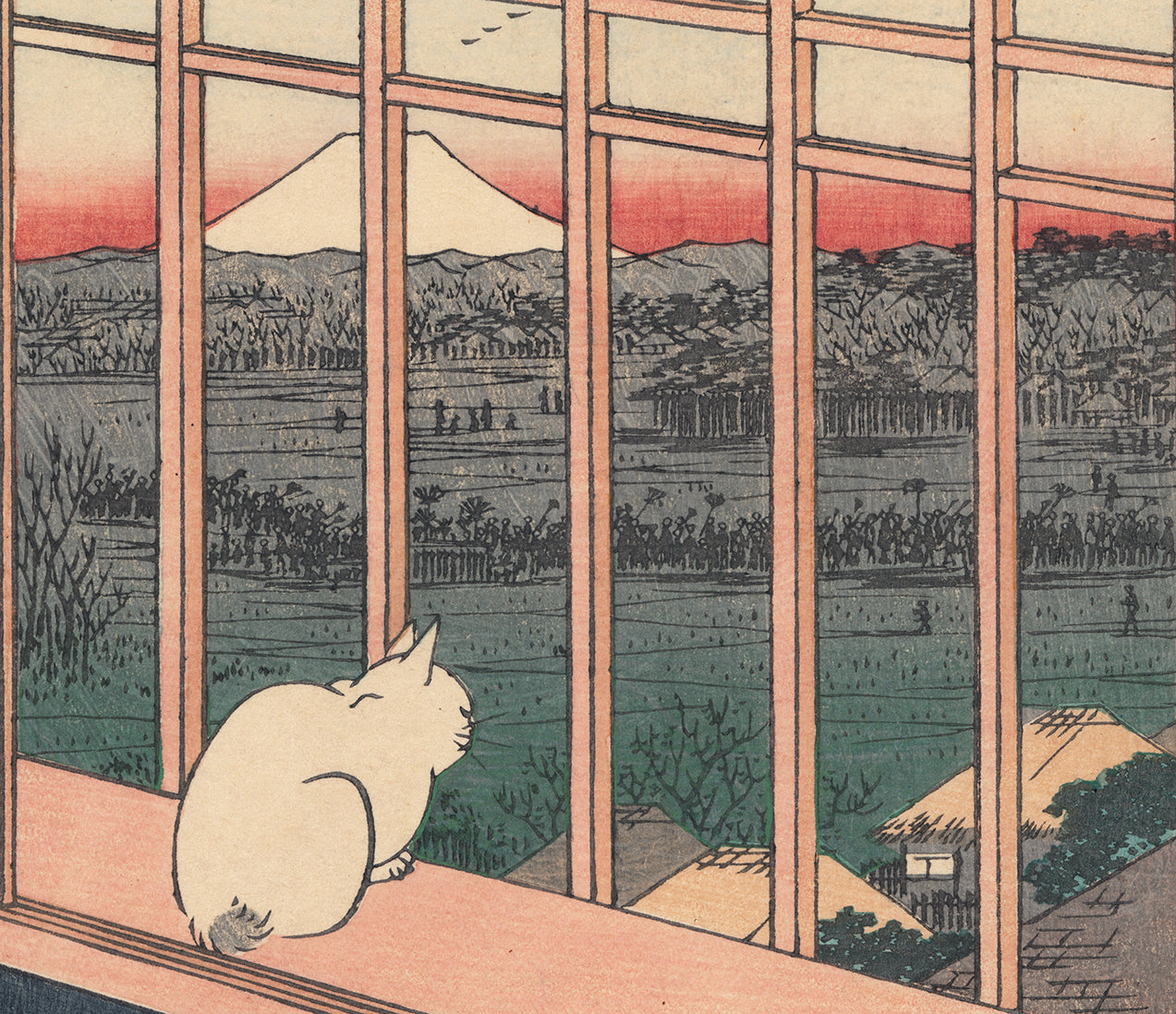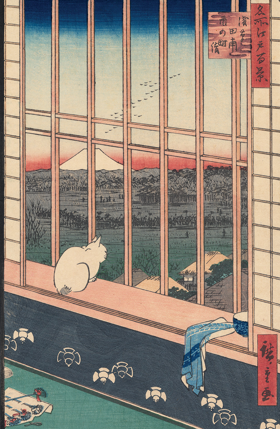 Hiroshige 広重: White Cat in Window Gazing at Asakusa Ricefields and Torinomachi Festival (Reserved)