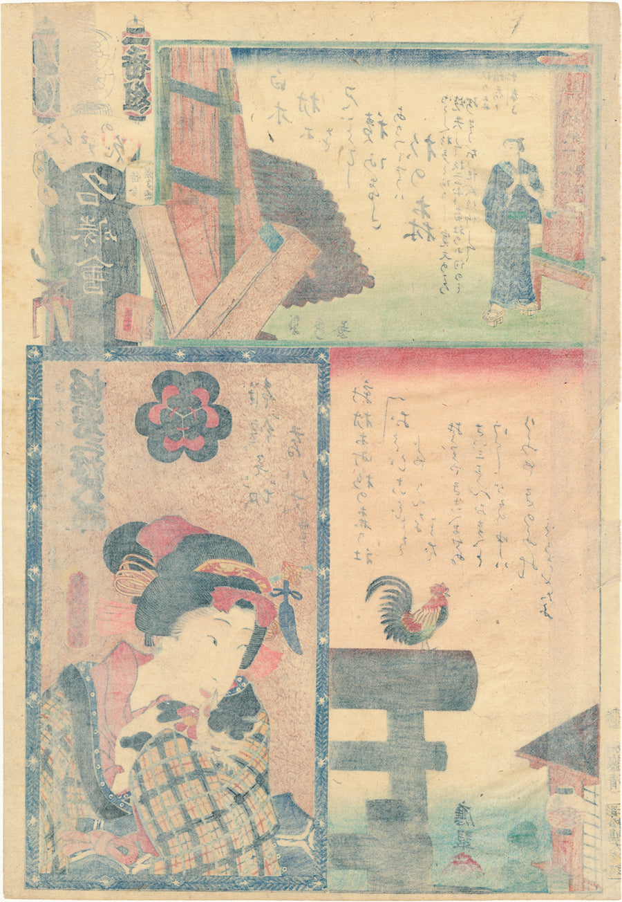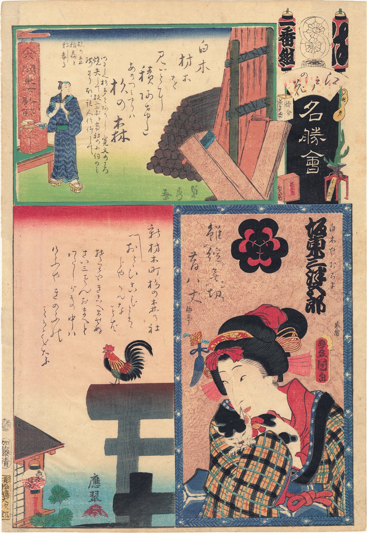 We see a young beauty with a checked kimono hugging a cat close to her. The role of Okoma is from the play Koi Musume Mukashi Hachijo; she is a main character who is falsely accused of murder whose family are timber merchants. She looks to the left, and we see a rooster atop a torii in a panel by Asai Osui. Above, we see planks of wood, one being sawed thin, for a factory that makes wooden geta clogs. This upper image of a lumber yard at Shiraki Village is by Utagawa Sadahide.
