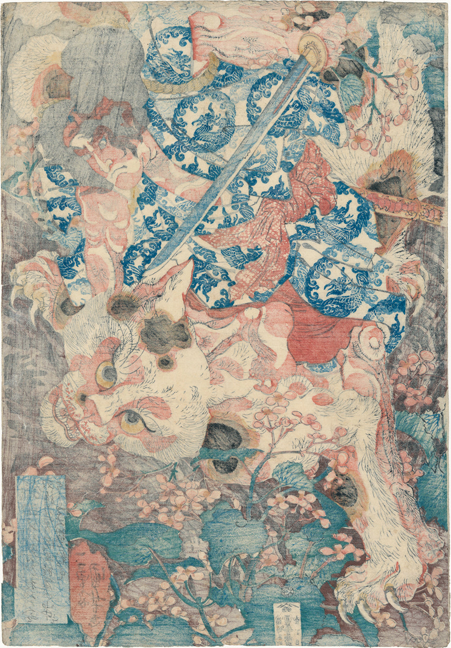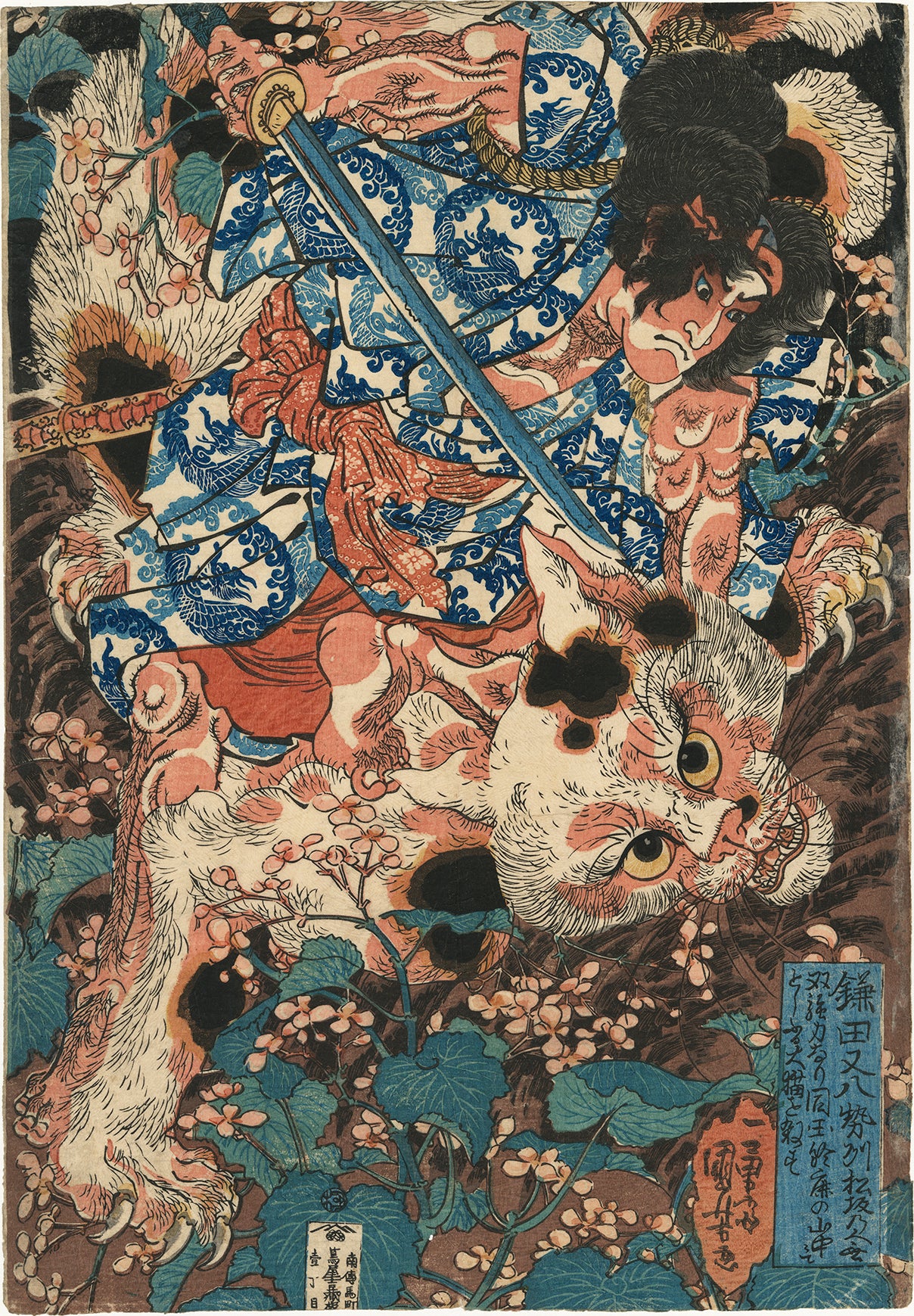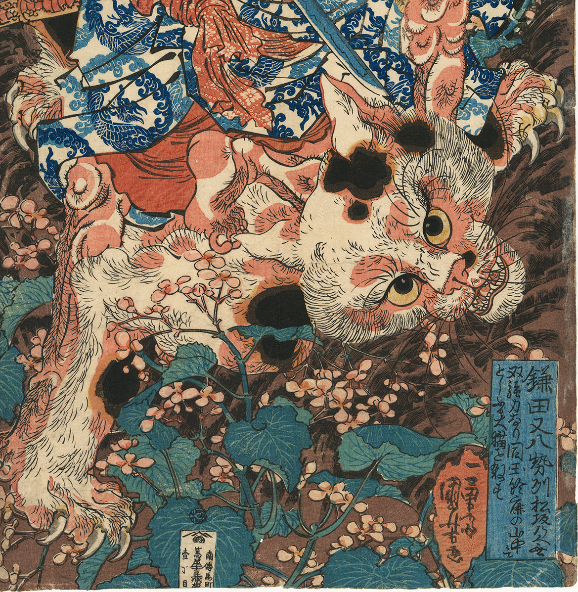 A giant, muscled monster calico cat with yellow eyes is pinned against the ground by Matahachi, who readies his sword for the final stroke. With the vibrant action unique to Kuniyoshi, the hero’s garments sway actively with his movements, and we feel the anguish and anger of the monster cat, trapped at last. The hero’s face is framed by halos of flowing hair, and his skin features chiarascuro, which emphasizes his own musculature. We can see we are in a fantastical space by the cavelike background and exotic flowering plants. In the background we glimpse the cat monster’s forked tail. The cat’s fur features blindprinting.  Kamada Matahachi was a heroic figure featured in several stories in the kurohon light fiction genre. Born in Matsuzaka in Ise, he traveled to Edo to perform heroic deeds and vanquish evildoers. Here he is shown getting the better of a monstrous cat that lurked in the mountains of Sieshu. This episode is based on an earlier book from 1769, Kamada matahachi bakemono taiji. The mercurial nature of cats, combined with their penchant for hunting and unknowable mien, made them ripe for transformation into monsters. Scarce, especially in this condition.