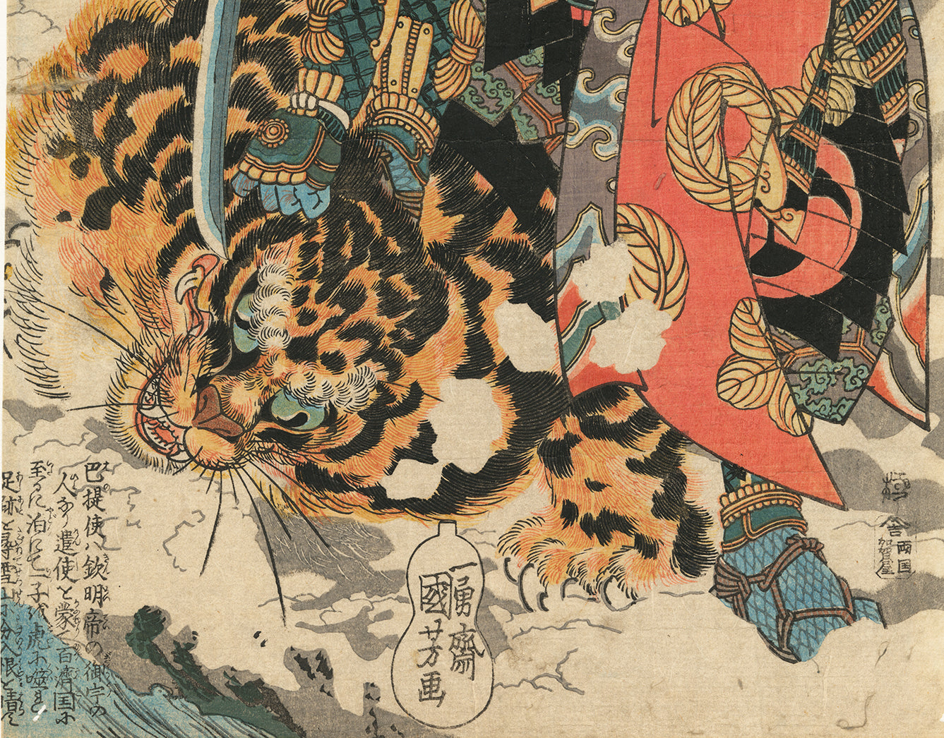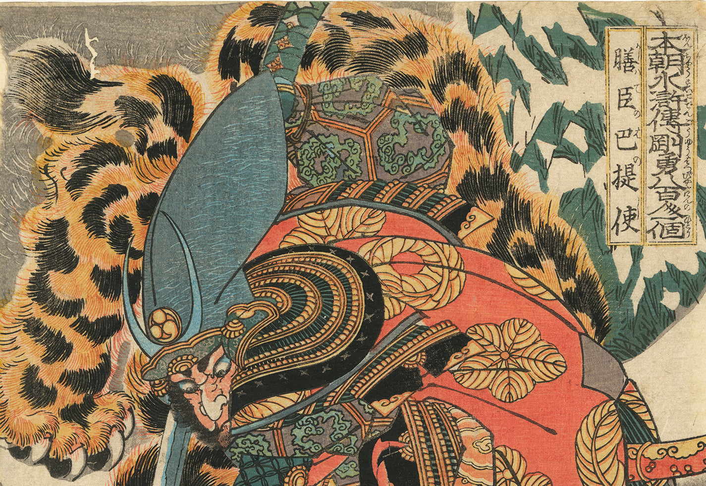 Kashiwade no Hanoshi has pinned an enormous tiger to the ground, his blade drawn and expression fierce. Both warrior and cat have eyes that bulge with blue intensity. According to Timothy Clark (see reference below), the text on the print states that Kashiwade was sent to Korea during the reign of Emperor Kinmei, and that when a wild tiger attacked a child in Kashiwade’s party that the warrior tracked the tiger into snow-covered mountains and killed it. Despite this text that is written on the print, his viewers in the 1830s would have known that this is really a portrait of the warrior Kato Kiyomasa (1562-1611), and that he is hunting a tiger during the Korean expedition in the 1590s under the order of Hideyoshi. Kiyomasa wore this very distinctive helmet and his garments have patterns associated with him. Censorship regulations banned references to historic events later than 1592, in part because the ruling Tokugawa family had pretty much destroyed Hideyoshi’s descendants. Kiyomasa remained a popular subject in warrior prints nonetheless.