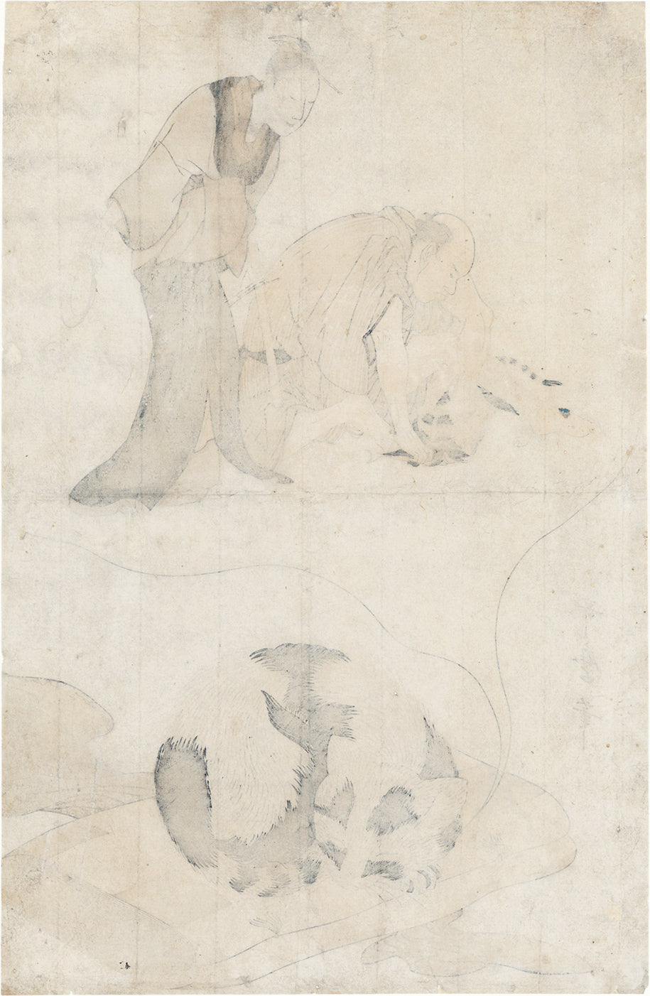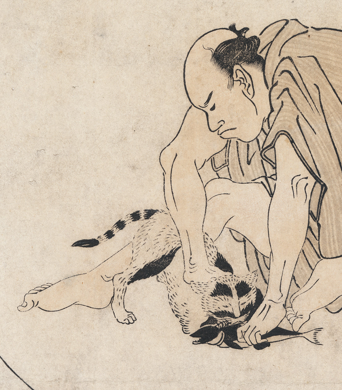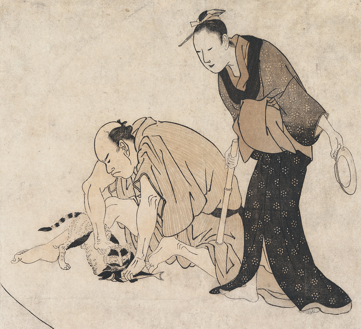 A sleeping cat has curled up atop a freshly unwrapped bolt of cloth (something rather naughty in and of itself), looking quite contented, almost smiling. We see its dream bubble above, as it has caught a fish. There is more to the dream-story, as the fish is being taken away by an angry-looking man, although the woman next to him looks more amused than anything. She holds a bamboo tube that might be used to help start a fire, as well as an empty plate, so she has perhaps been cooking. Utamaro designed several other prints with dream-bubbles, but the dreamers in those designs were humans. This design was used as a cover image for some Tuttle editions of the novel “I Am a Cat” by Natsume Soseki. This work is so scarce that none seem to survive with the colors intact.