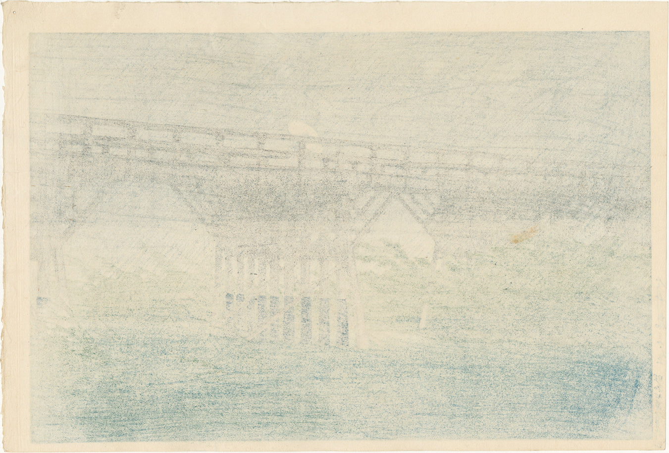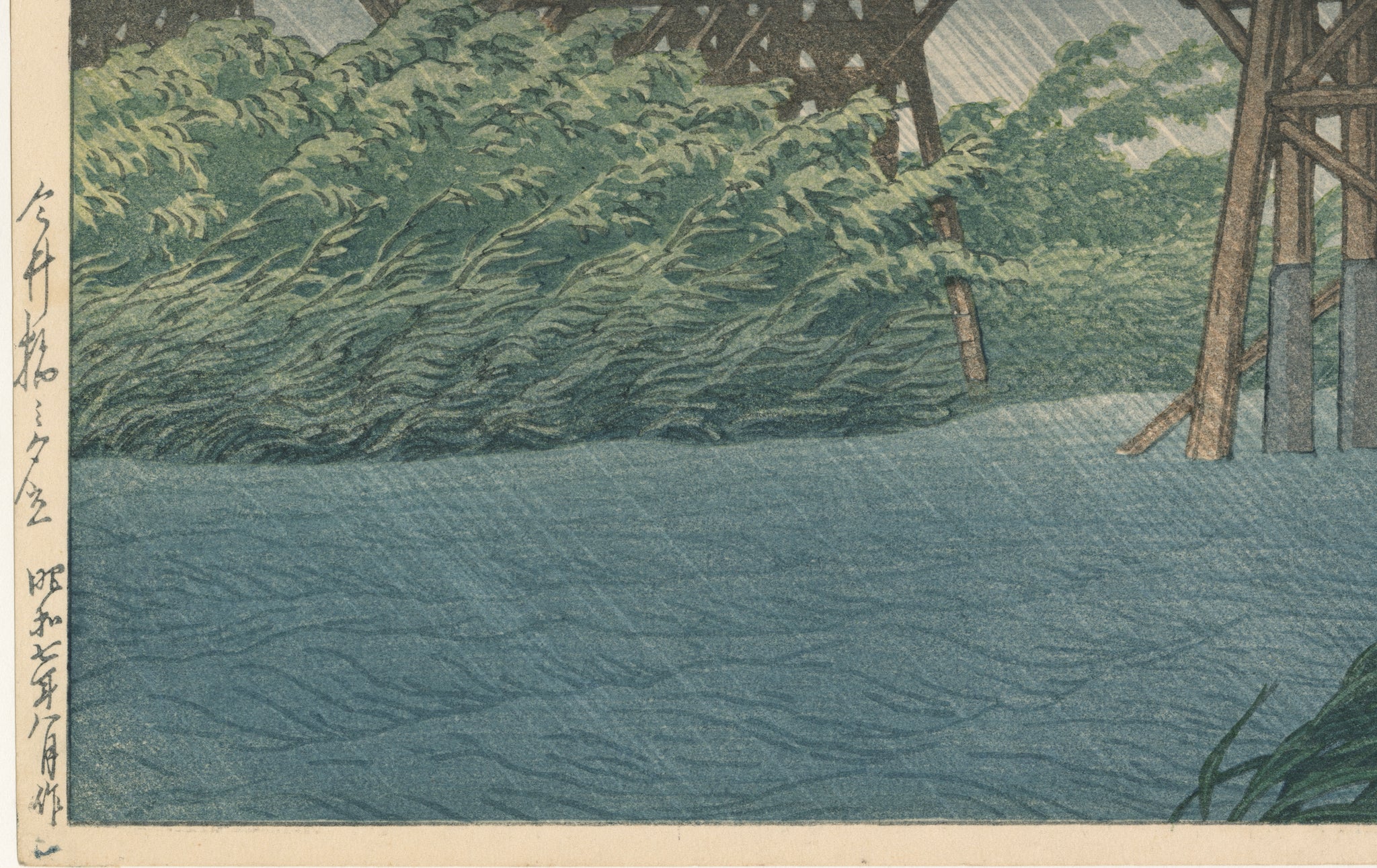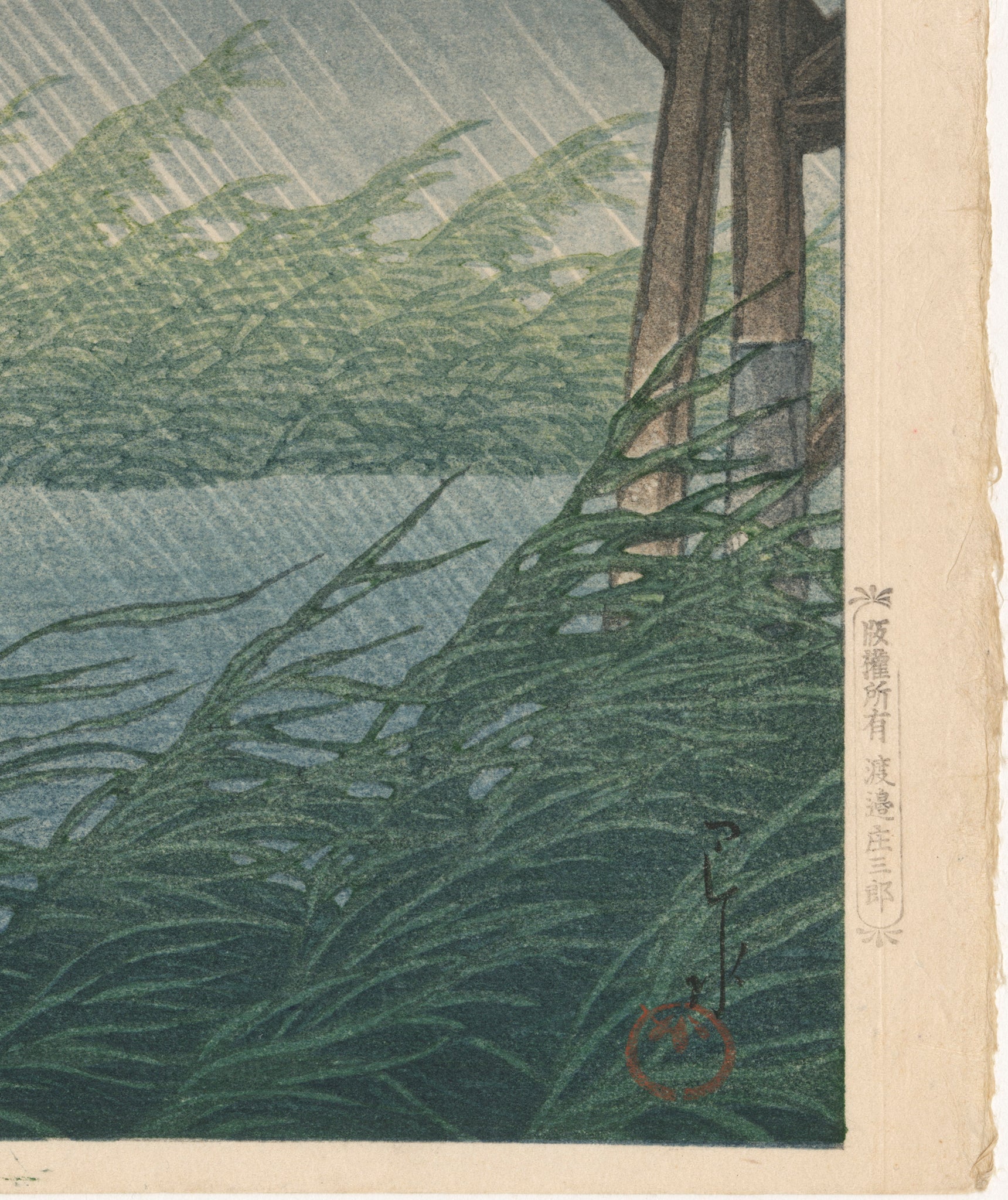 A woman crosses the sturdy wooden Imai Bridge, yellow umbrella braced against the diagonal rain. Her figure is mostly obstructed, but she provides a burst of color and a focal point for the design. The diagonal of her umbrella matches that of various bridge supports that lean to the left, and is a design counterpoint to the reeds that bend to the right both in the foreground and in the middle ground, as well as some of the opposing bridge supports. The vegetation is comprised of many shades of green, with a deeper green shown in the reeds buffeted by the wind in the foreground. The many layers of texture give this design a great deal of depth and interest, although done with great subtlety. From front to back, one sees the reeds in the foreground, the textured waves, then the bridge supports, then more vegetation, then the figure of the woman, and lastly the textured sky. Atop it all is the rain, done with great finesse in soft whites and greys. This is the finest example of this design that this dealer can remember seeing; it needs to be completely unfaded, as here, to truly appreciate the sensitivity of the artist and his collaborating team of artisans. We can also notice a connection to the famous Hiroshige design of Ohashi Bridge in the rain, although this is probably subconscious on Hasui’s part. Imai Bridge connects Edogawa City in Tokyo with Ichikawa City in Chiba Prefecture. Instead of this attractive wooden structure, today it is a charmless steel edifice meant for car traffic. Although there is considered a "dark" version and a "light" version of this design, this version would land somewhere in between and on its own, with a more blue-colored sky and fresh green colors. This in-between-ness is quite common with "dark" and "light" versions of Hasui's work, and in this dealer's experience, rarely are examples clearly binary. With the Watanabe seal "C" that was in use between 1930 and 1942.