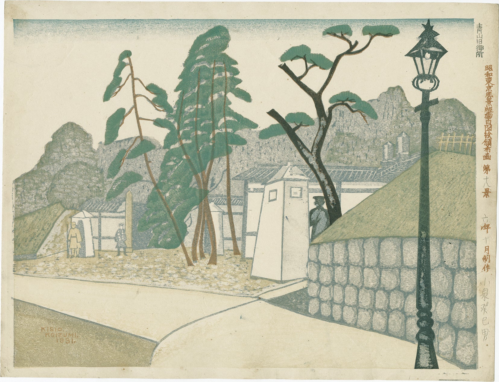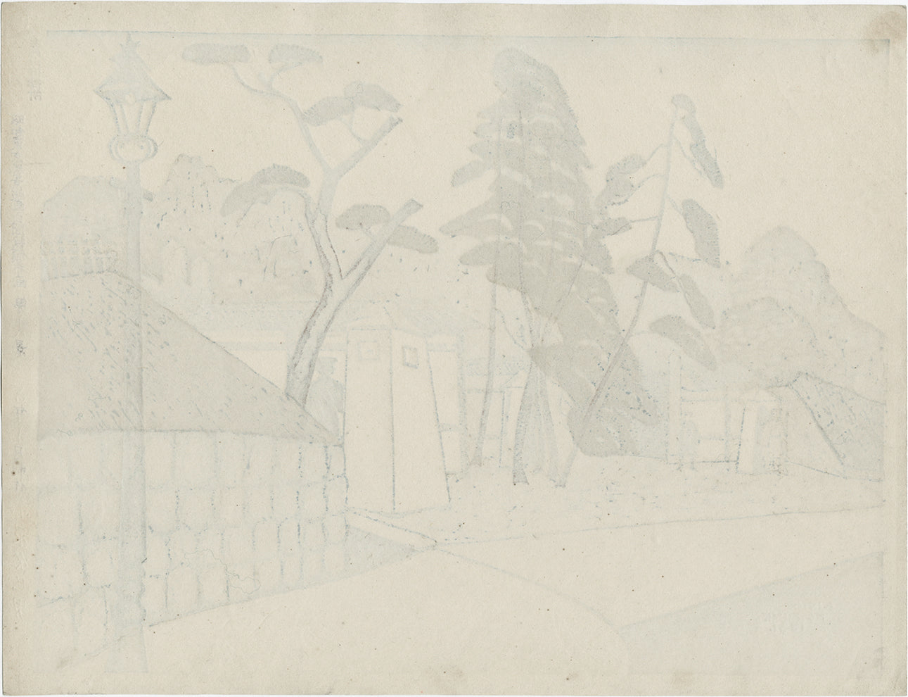 The Aoyama Palace built as a temporary residence for Emperor Meiji in the 1870s; in 1931 it was the was residence of Emperor Hirohito’s brother, Prince Chichibu (1902-1953). The stone wall is fronted by a period lamp, and several trees are seen near the entrance to the compound. We see three uniformed watchmen guarding the gate. As noted on the MIT website: “This image resonates with the renewed emphasis placed on the sanctity of the imperial reign during the 1930s.” There seem to be two versions of this work, with only slight variations. This work has all of the series information in the right column (instead of the left column), and the artist’s signature and date in the left corner are written completely differently than the other version; it also lack’s the artist’s seal.  This dealer would surmise that this is the earlier version. This is the same version that is in the Wolfsonian collection.