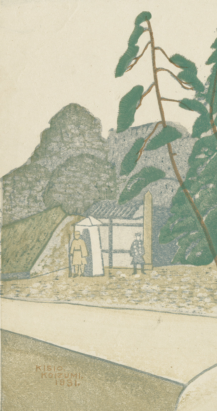 Koizumi Kishio self-published 100 designs in this very interesting series, although it took nine years to complete after the first work was published in 1928.  In general the designs are very strong, and have a fresh perspective that is distinctive to this series. These works were sold by subscription club, which the artist declared to be limited to 50 members. Right margin bears title, with date.  Koizumi was guided by Tobari Kogan, and was one of only two sosaku-hanga artists (the other being Hiratsuka Un-ichi) to have received extensive training in block carving from professional block-carvers.