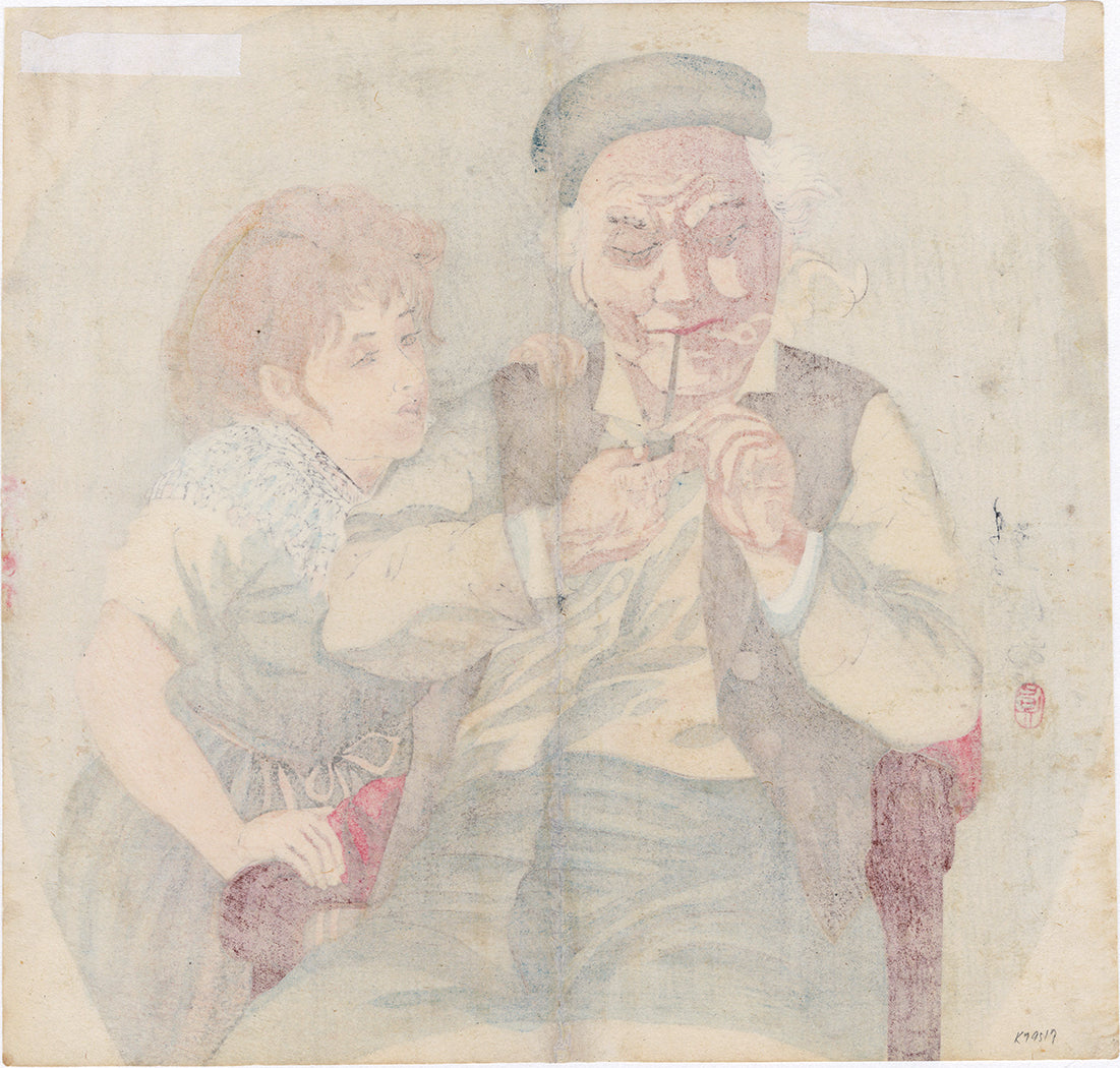 A western man wearing a cap lights his tobacco pipe, a red-haired younger woman at his side. It is in the shape of an uchiwa, or fan, and would have been cut out and pasted on an actual summer fan. The keyblock, such as it is, has been created in an extremely loose sketching style, as if drawn by a western pen. Also unusual are the treatment of shadows and use of multiple blocks to give depth (chiarascoro), all borrowed from the west. The western subject and setting are also unique to this print. This seems like an advertisement for tobacco to this dealer, also as there is no publisher or date information. Perhaps the verso of the fan would bear the specific information for the brand. The intense focus of both the man and the pretty woman on the lighting of the pipe lends weight to this idea. In the Meiji period, advertising on these summer fans became quite popular. Extremely scarce.