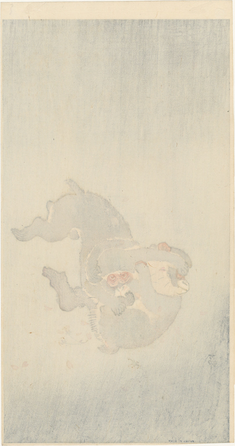Two monkeys (Inuus speciosus, Japanese macaque) playfully wrestle–falling cherry blossom petals and a nearby twig would hint that they are perhaps pictured in mid-fall from a cherry tree. The publisher of this work is unknown; in the Crows, Cranes & Camellias catalog, it is mentioned that this work was first published by Daikokuya, and that it was later published by Adachi. The image shown in that catalog (number 31) seems to be from the same blocks as this example, although the cherry petals are here more prominently printed in pink in the background. The background grey block also has woodgrain evident in this example. Both examples lack a publisher’s seal as well as an artist’s seal. However, it is certain that work was printed at the latest in the early 1930s, as it has the “Made in Japan” seal verso, which was only applied in the late 1920s and early 1930s for prints intended for export from Japan. The paper and the style of printing conform to many Koson prints that this dealer has seen that seem to have been printed about 1925-35 and that lack a publisher’s seal. We wonder if this printer had a relationship to Robert Muller, who was exporting many prints at the time, and might even think that Watanabe might be responsible for some of them, although this is not supported by scholarly research and is only a hunch. To our knowledge, Adachi did not work in shin hanga originals in the 1930s, but only on ukiyo-e reprints, so we would not identify Adachi as the publisher of this work. In any event, this seems to be a very scarce design. We’ve only found one example online that includes the artist’s seal.