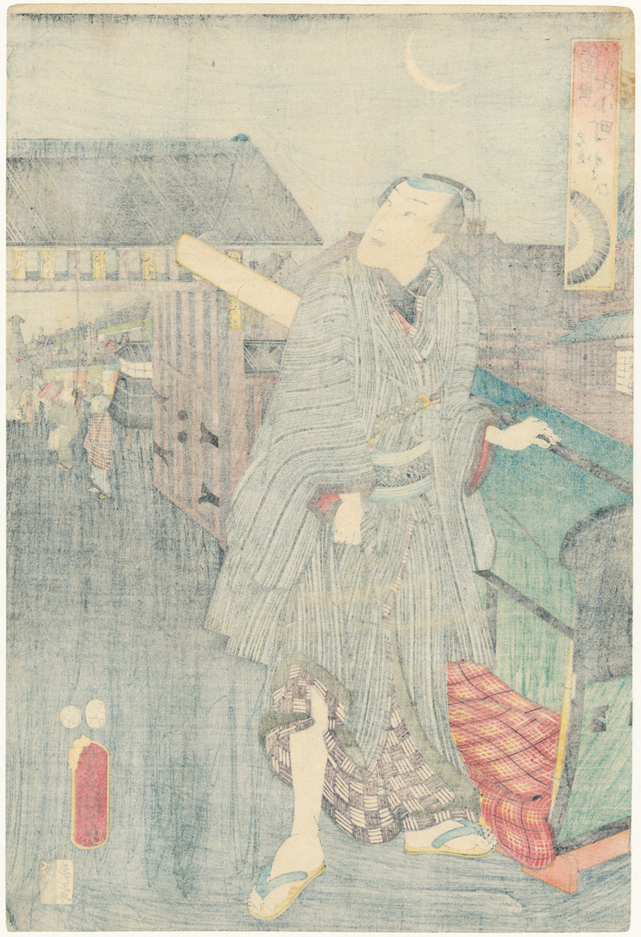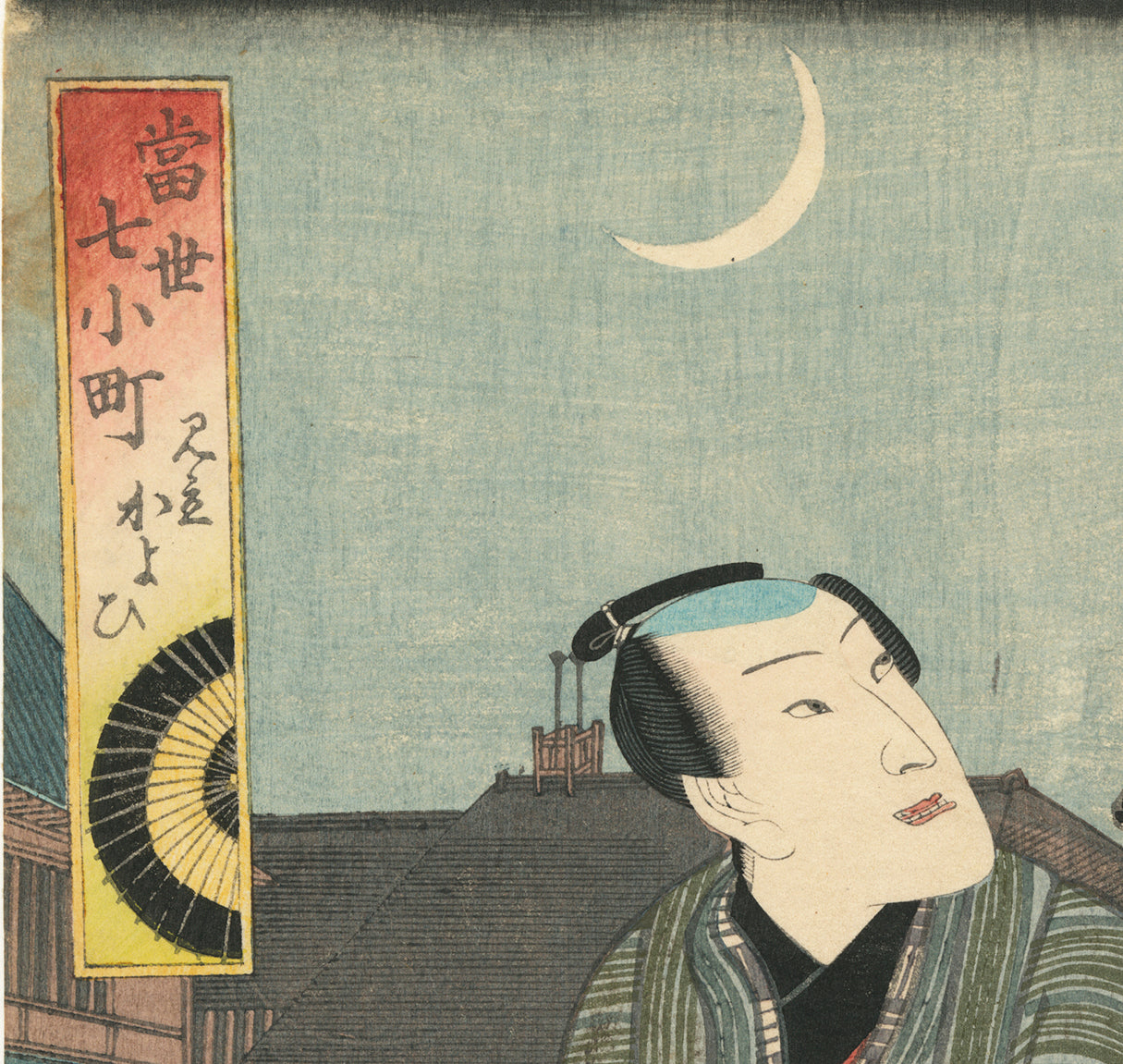 Visiting (Kayoi) Komachi, a layered mitate or parody of one of the famous Seven Komachi episodes. An actor puts a hand on a palanquin and gazes towards the entrance gate of what seems to be the pleasure quarters. We are not certain if he has just arrived or if he is departing. A crescent moon hangs above.