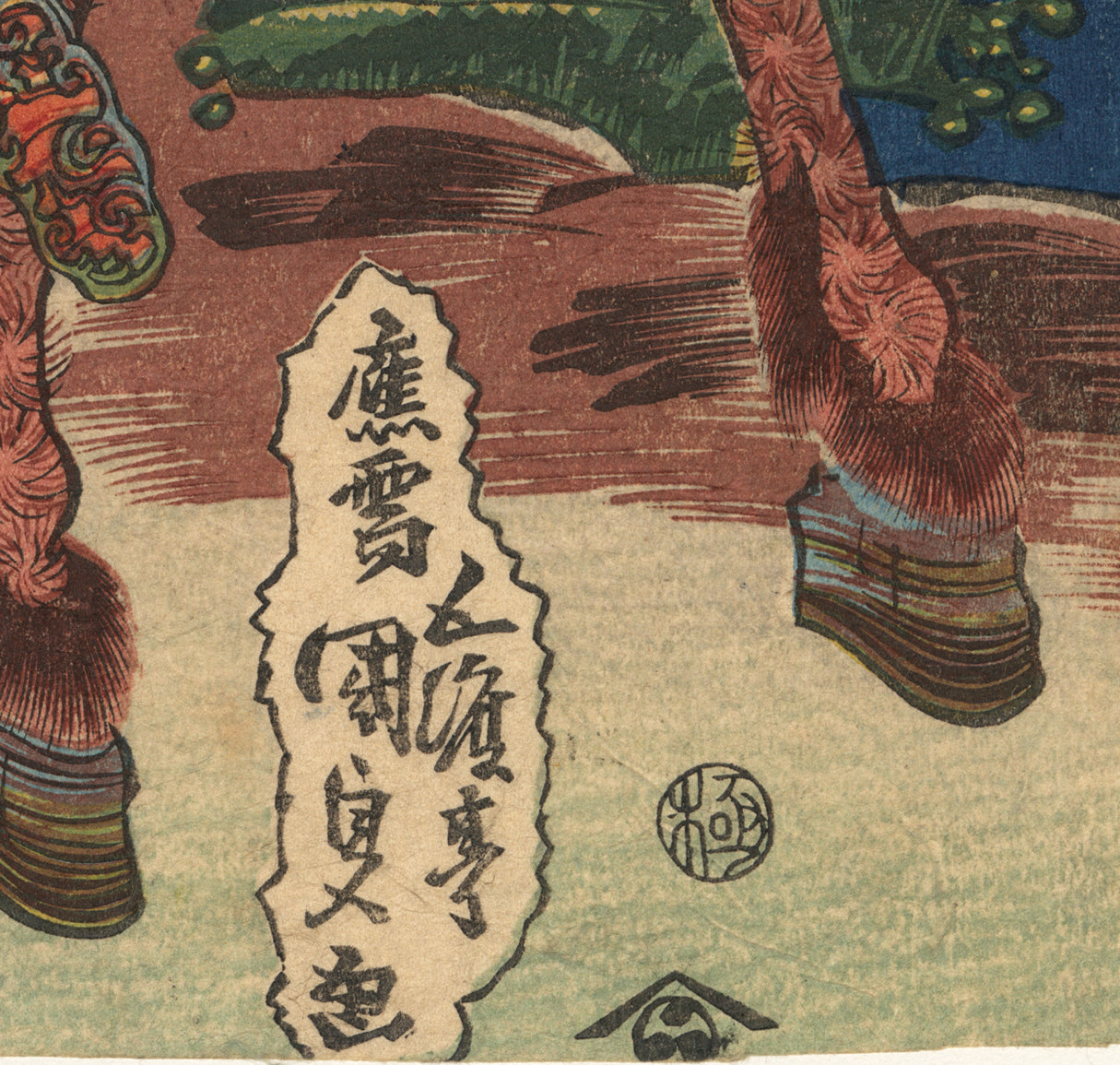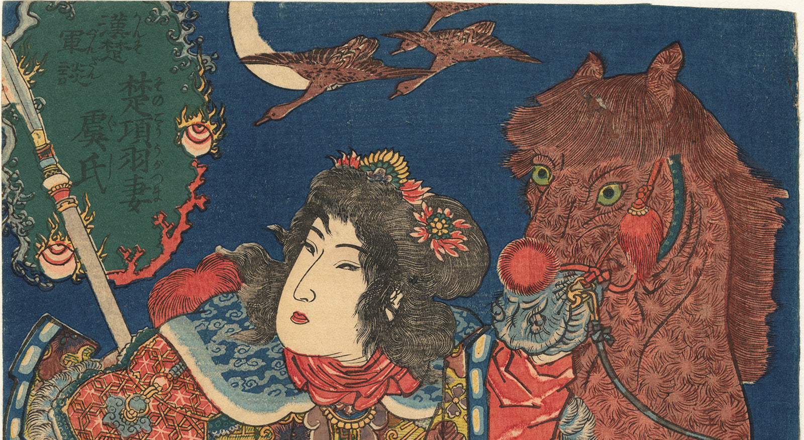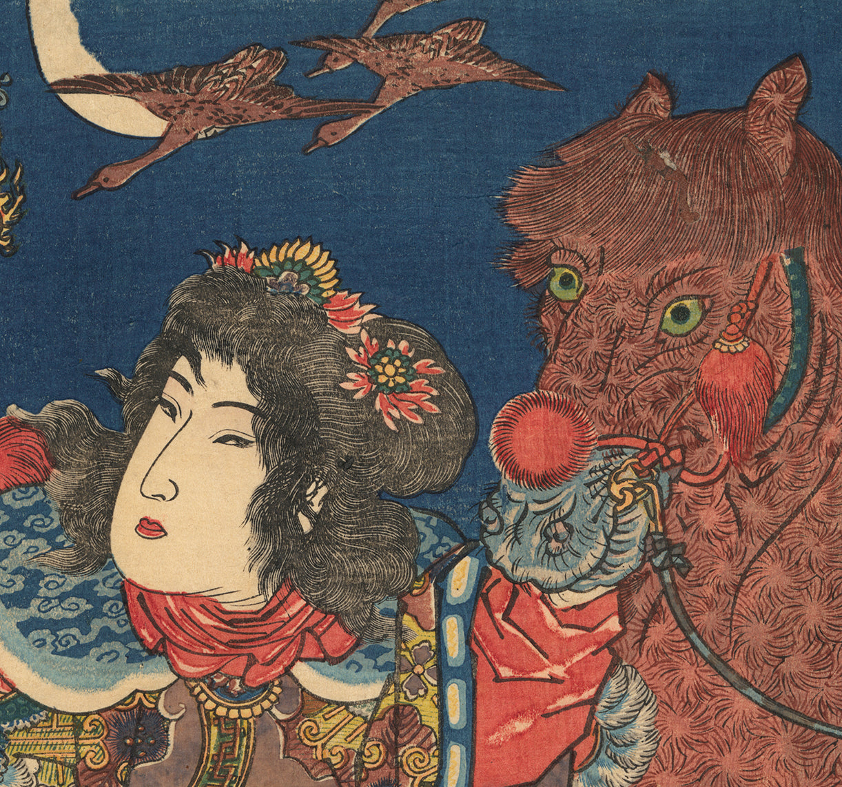 We see the historical Lady Yu dressed from head to toe as a Chinese warrior and holding a fearsome double-edged pole arm weapon. She wears layer upon layer of military finery and with one arm holds the bridle of a horse. The coat of the horse has been rendered with starbursts of fur in an unusual way, and the background has also been rendered in a non-ukiyo-e manner. This series might be seen as a challenge by Kunisada to Kuniyoshi, who had almost single-handedly created the new musha-e (warrior) genre. Great attention has been paid to Lady Yu’s costume, which includes complex components that are highly decorated. Her expression is one of determination, and she wears a red undergarment that circles her neck; both the horse and this garment seem to presage her ultimate sacrifice, taking her own life so that her husband can escape the enemies that surround them. Her husband thus escapes on horseback, carrying her head on the pommel of the horse.