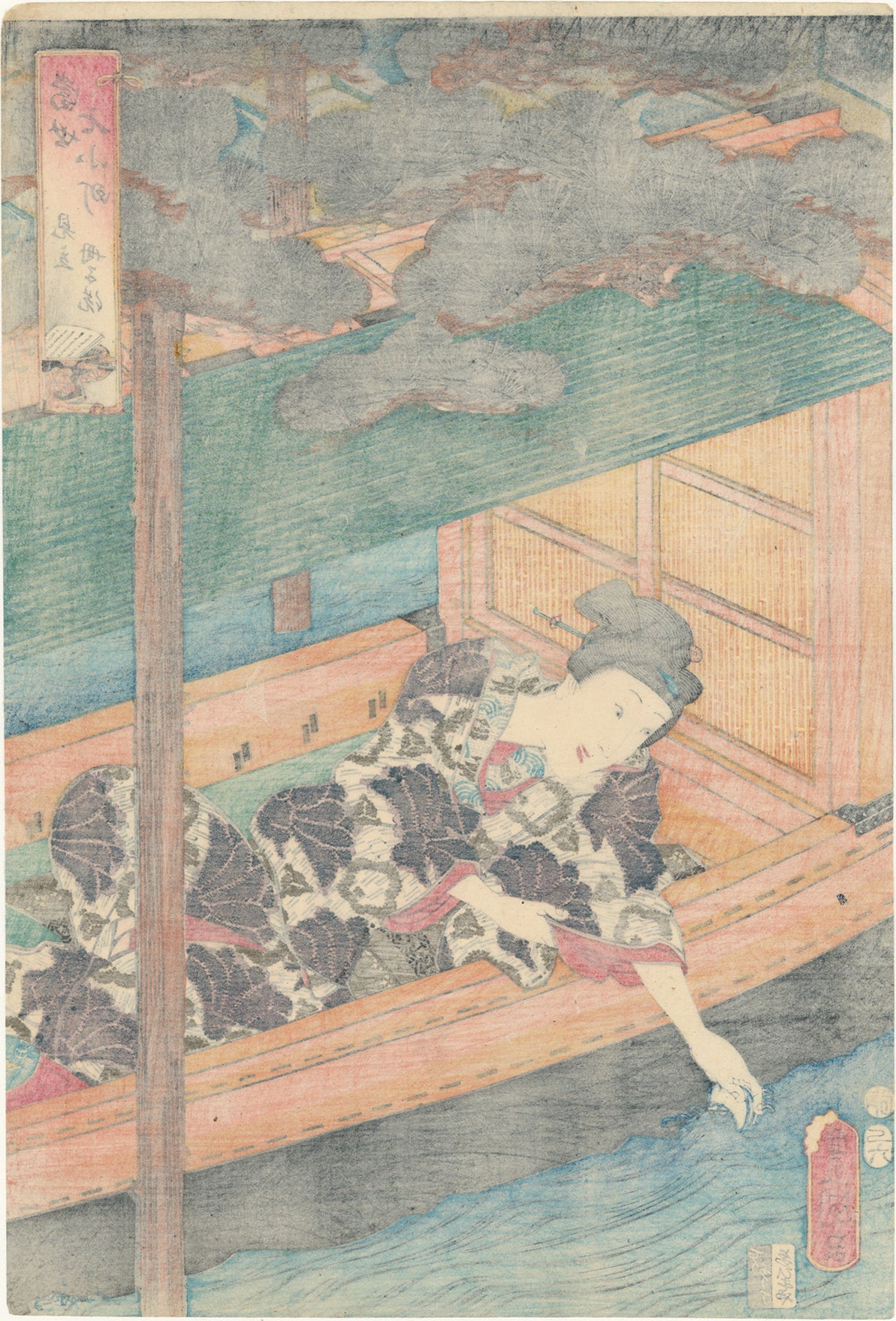 We see a kabuki actor in a female role on a pleasure boat on the Ó-kawa, (river), washing out a small sake bowl. They wear beautiful layers of fine summer kimono. The are smiling as they hold one sleeve above the river so that it keeps dry. Above are pine branches.