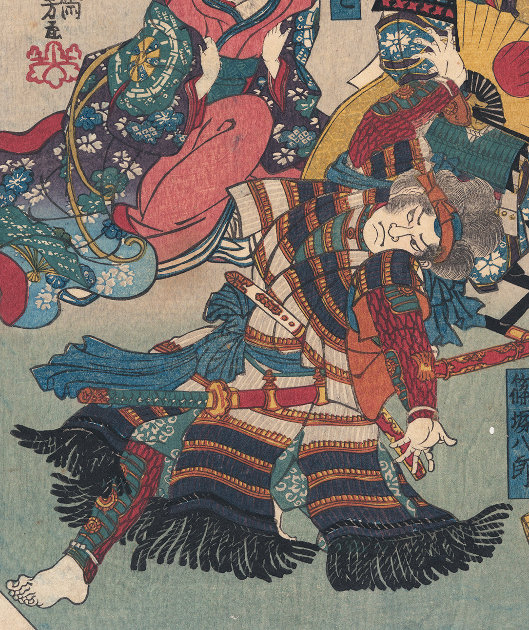 Yura Hyogo sits on a camp stool, fan in hand, his wife Minato seated beside him. They watch Shiozuka Hachiro performing what looks like a dance, but is actually the reporting of the events leading to the death of Nitta Yoshioki when his ferry boat was sunk by his enemies in the Ashikaga clan. This story comes from the Taiheiki, the historical epic from the 14th century that recounts the war over the imperial throne. The setting seems to be a battle camp, and Yura Hyogo wears full battle armor, a camp curtain rolled up behind him. Shiozuka Hachiro wears a very serious expression, and his movements are very dramatic. The actual incident of the ferry is shown in the third image from this same series. This would seem to be the earliest variation of this design; note that the cartouche at top left is in the form of a stylized shrimp.