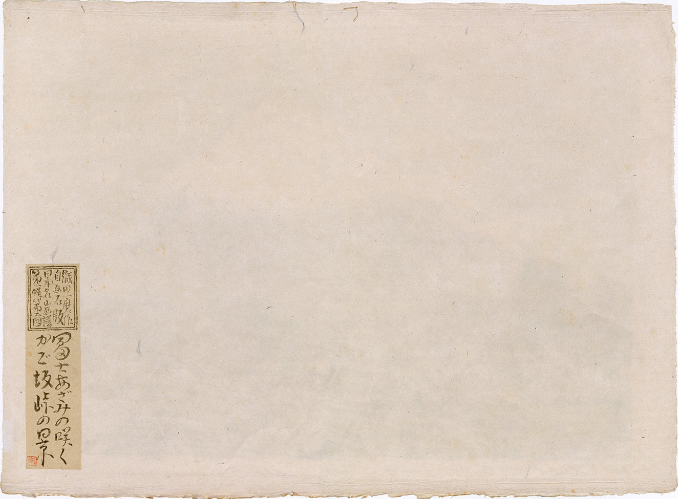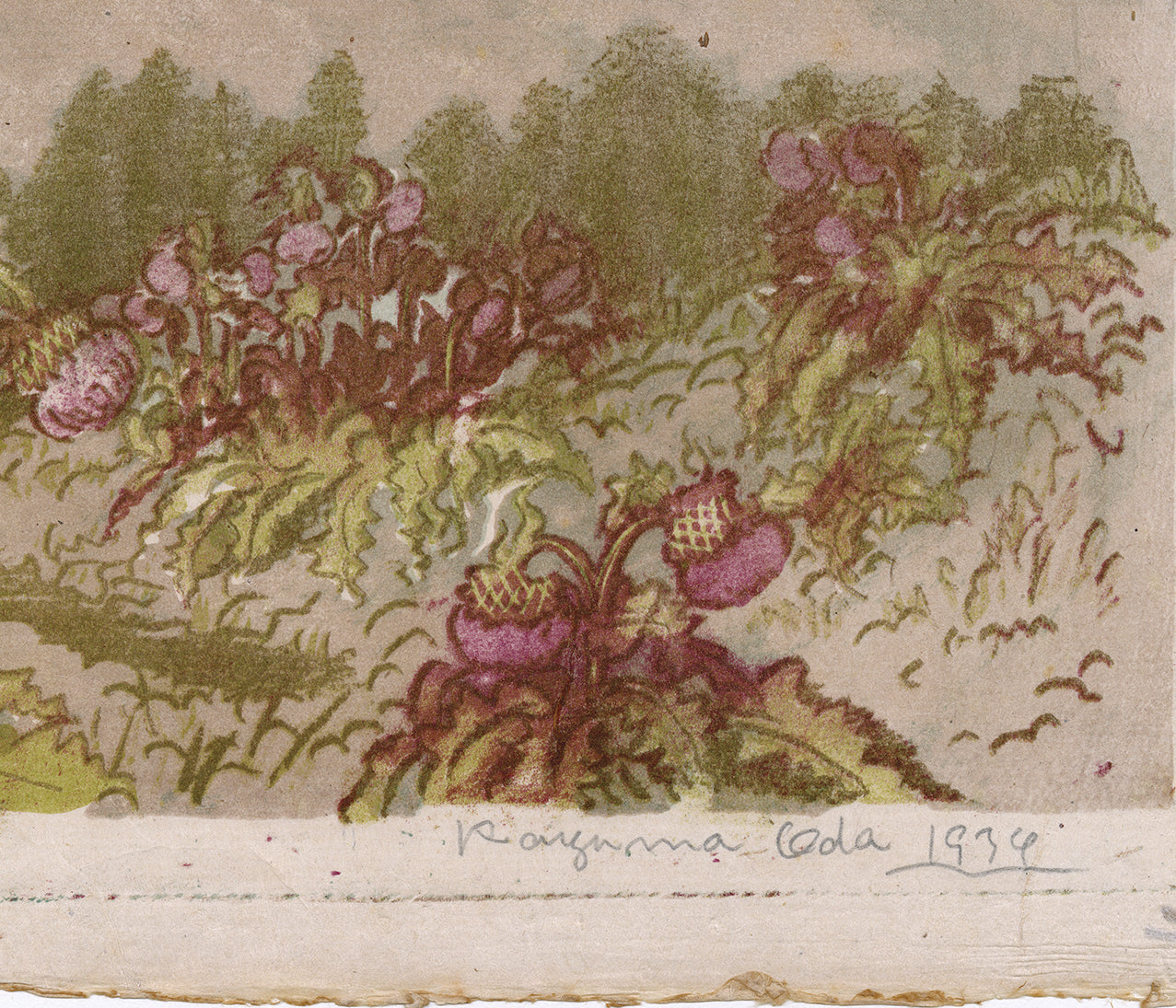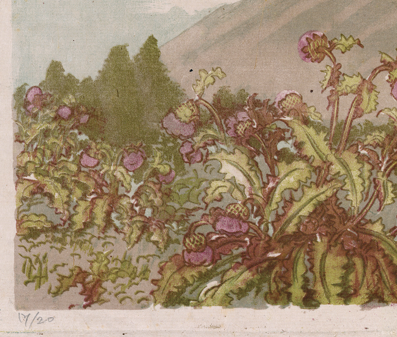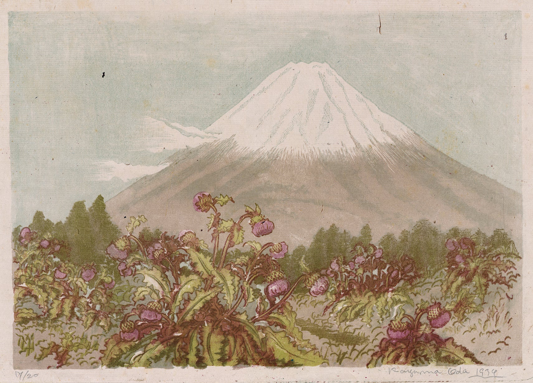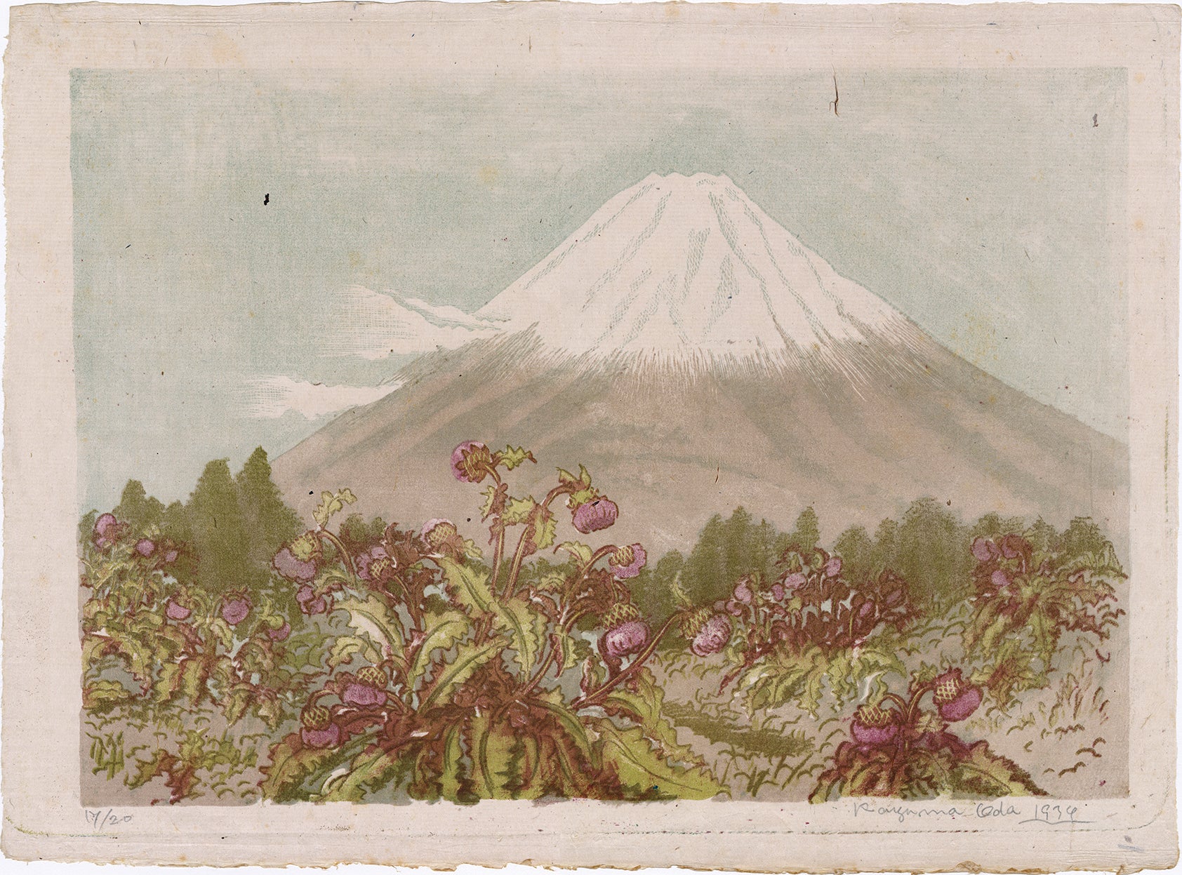 Oversized work displaying the artist’s mastery of color lithography. In the foreground are some bright and prominent Mount Fuji thistle (Cirsium purpuratum), which indeed grow in the environs of Mount Fuji, and are the largest of the Japanese thistle plants. This is an interesting rabbit’s eye view, rather than the usual bird’s eye viewpoint that we find in many views of Japan. Fuji-san seems also to almost be growing up from the ground in a parallel way to that all of the plants that are extending upwards. From a limited edition of twenty, with the artist’s handwritten notes verso. These read: (富士あざみの咲く かご坂峠の景)View of Mt. Fuji, Looking from the Kagozaka Mountain Pass with Blooming Thistles (with a red seal)(織田一麿作自画石版 日本名山画譜 第一輯 第ニ図)Picture Collection of Famous Mountains of Japan by Oda Kazuma own production of lithography, Second Picture of the First Volume.
