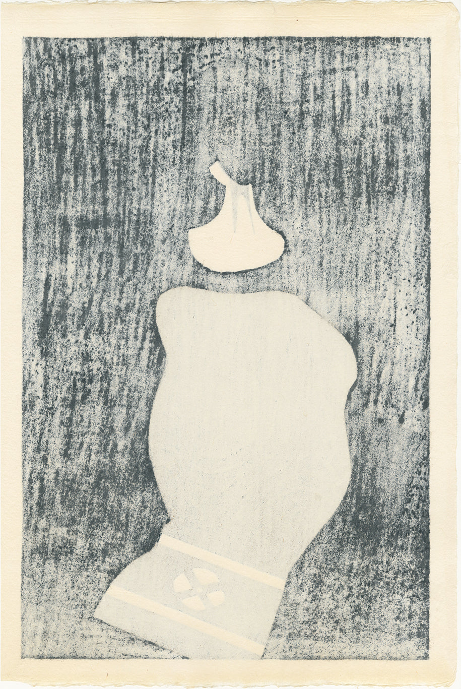 Portrait of a young geisha, shown seated from behind with her powdered white neck exposed and her obi sash gathered behind her. The pattern on the obi was brilliantly created using the natural pattern of the woodgrain with a method that emphasizes the natural pattern. Saito has captured the pose perfectly, although rendered in his minimal and mingei-like style. The background is a textured grey pattern that offers the feeling of the timelessness of the scene.