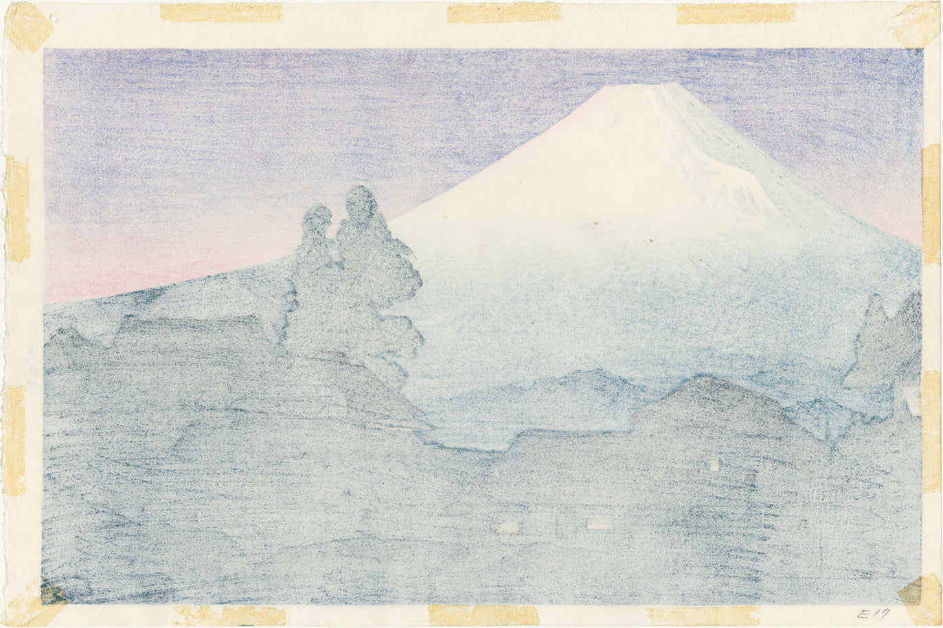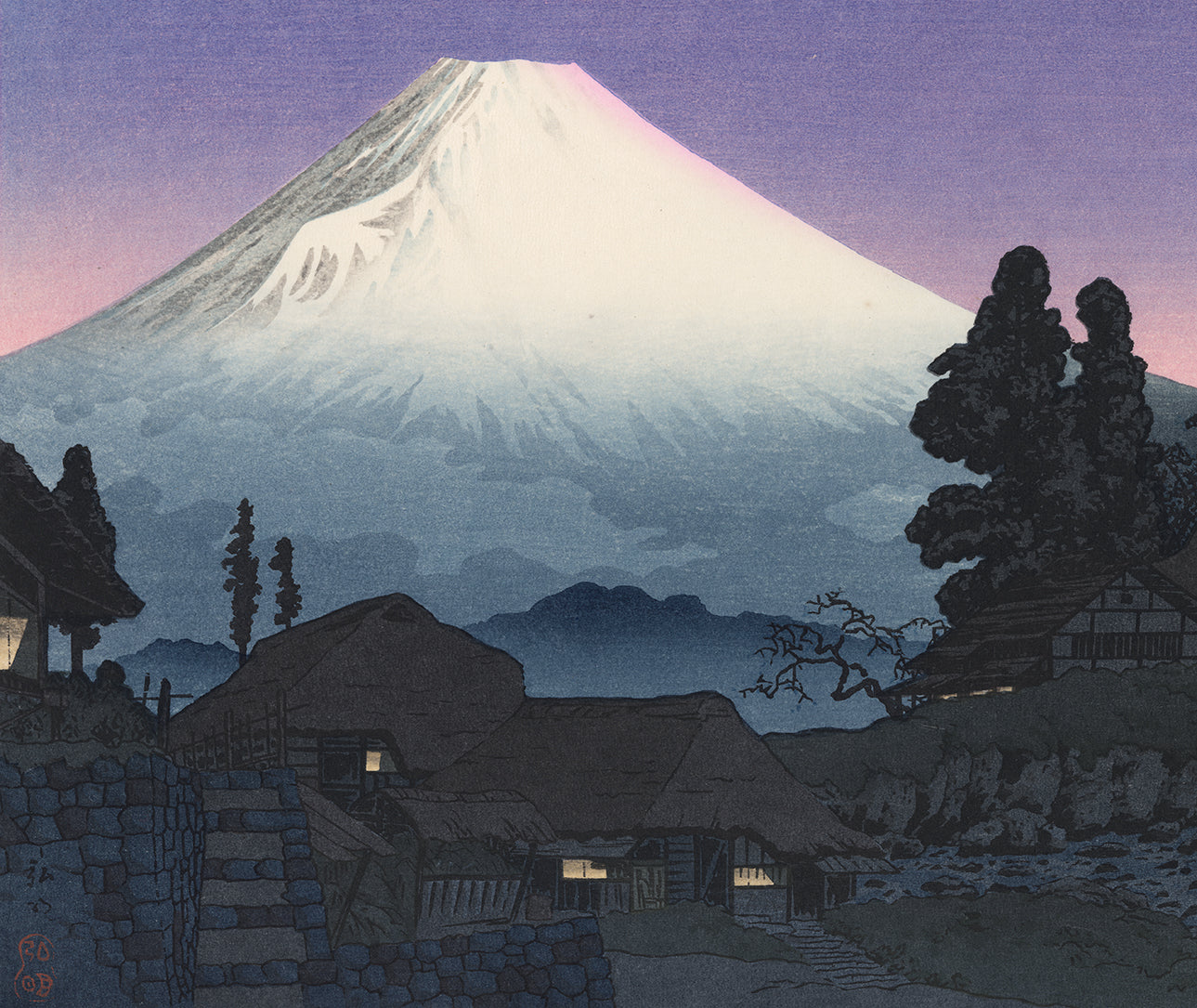 Mount Fuji is seen from Mizukubo, the sky a dramatic purple-pink. The prewar versions have a much more subtle coloration, but this version is more dramatic. This view is from Fuji’s less perfect southeast side, where the Hoei crater and peak were formed due to a huge eruption in 1707. We see a few thatch-roofed buildings that  crouch in the dusk beside a stream, their windows aglow with soft yellow. Most extant impressions of this work are postwar, as here; they also often bear no publisher’s mark.