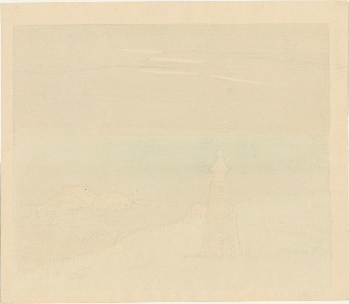 A timeless Japanese stone lantern that must serve as a lighthouse for ships is situated on a high, grassy hilltop overlooking the Sea of Japan. It seems to be standing watch like a sentinel over the calm seascape.  The color woodblock print also includes a cover sheet, the original paper mat and an accompanying printed sheet with two additional pages of information in Japanese that were authored by the artist himself. In it, he describes his visit to Sado Island and all the ways that it charmed him. This is from the first, limited edition of 100 sheets, numbered 51. The informational sheet is dated Showa 7, or 1932. Hiratsuka was a leading figure in the sosaku hanga movement and almost all of his later works (after ca. 1955)  were done in black and white. He is one of the leading figures of the sosaku hanga movement, and even taught wood carving to Shiko Munakata. Between 1935 and 1944 Hiratsuka taught the first blockprinting course at the Tokyo School of Fine Arts.