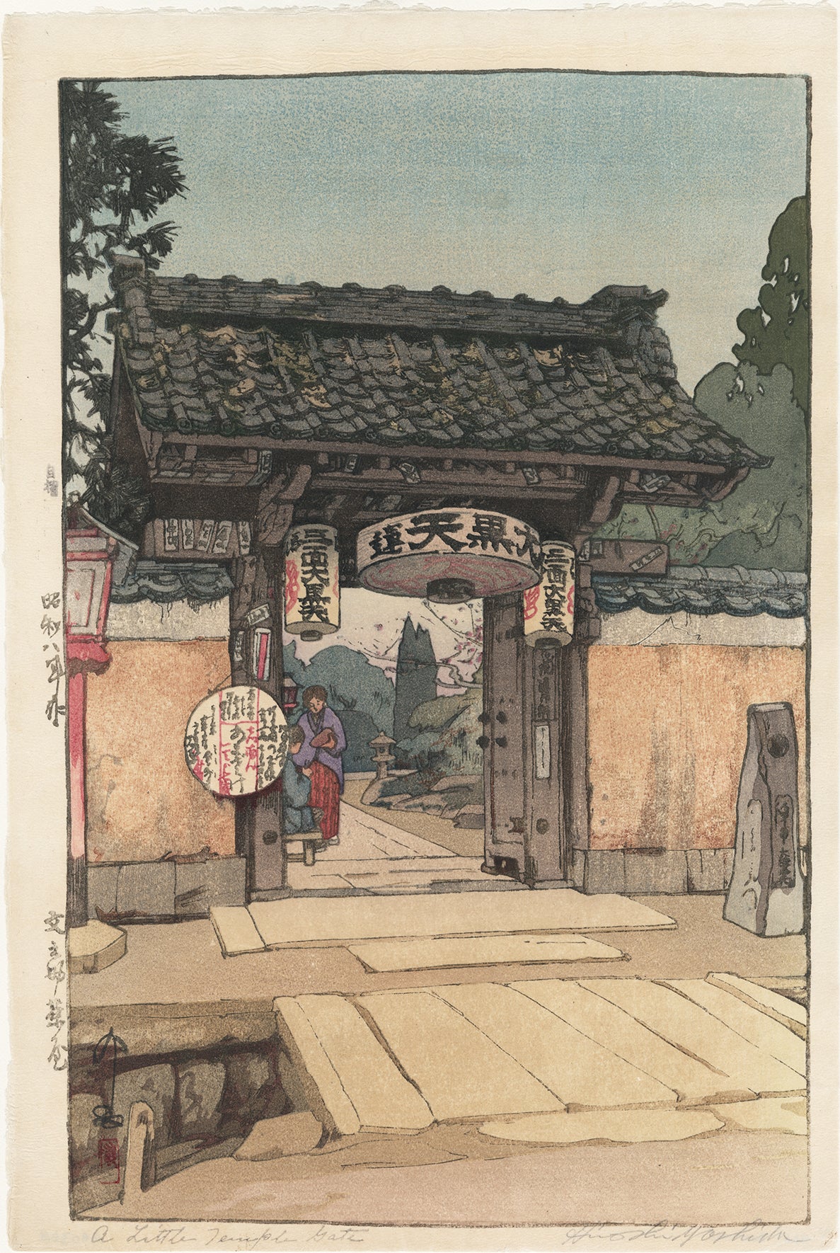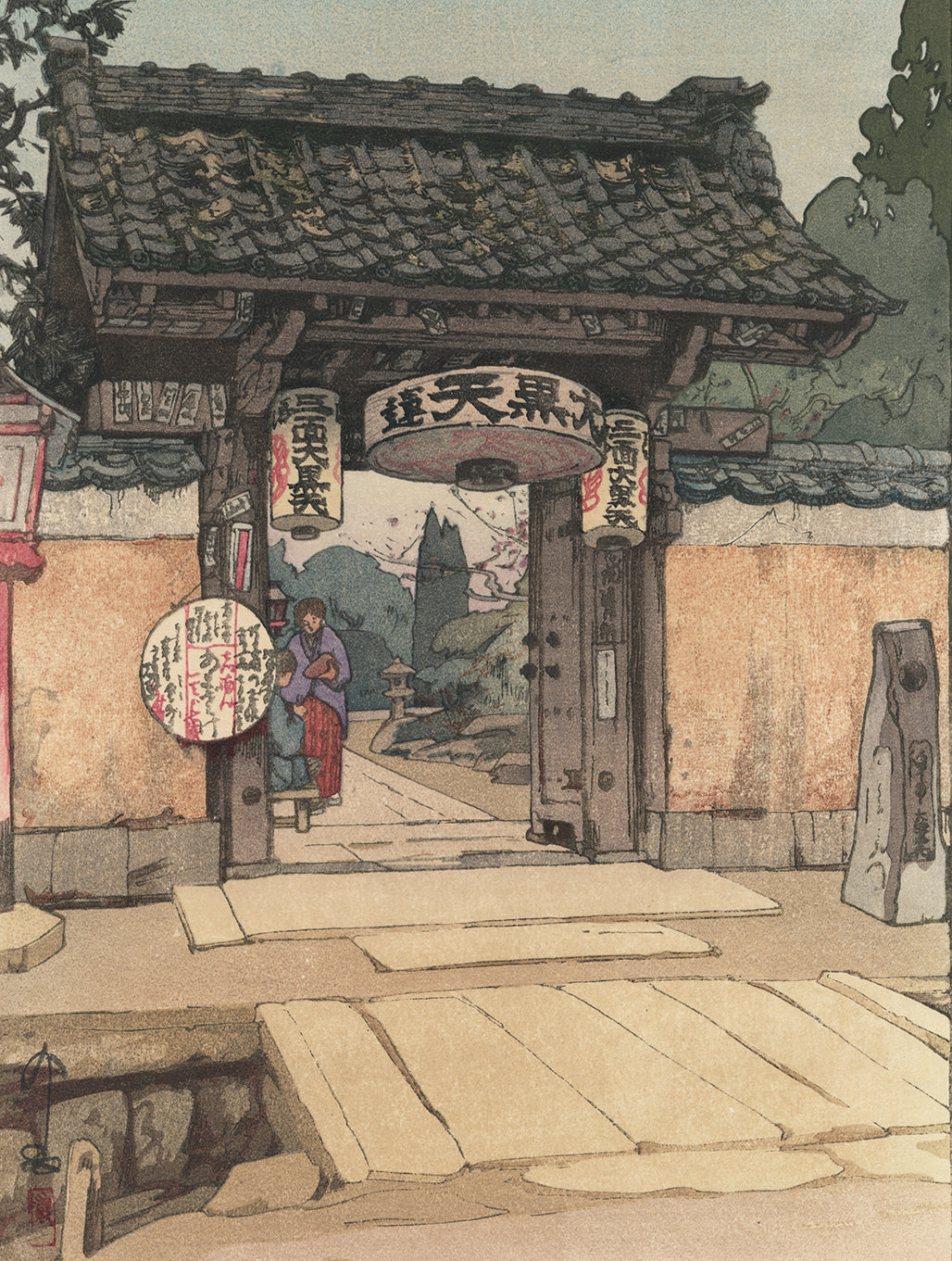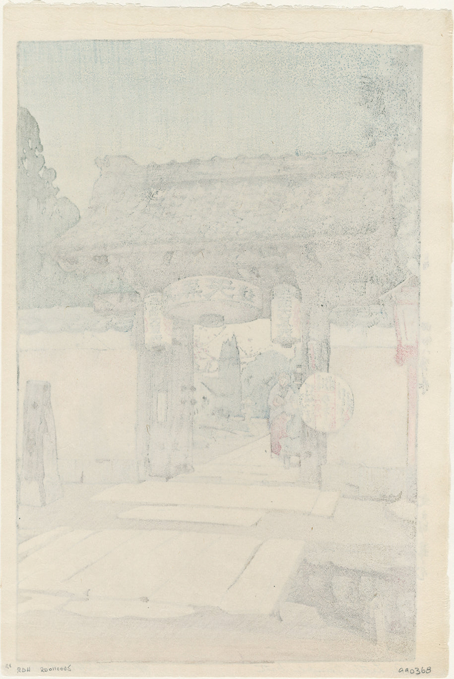 Outer view of the gate to Bunnosuke Teahouse in Kyoto. This teahouse opened in the Meiji period, and is still in business today at the same location in Higashiyama, the view of the entrance still looking recognizably similar. Just within the gate we see two women who appear to be waiting. From a series of views on the Kansai District. Creating this artwork required 14 blocks and 63 impressions. Pencil signed, with the “jizuri” (self-printed) seal, indicating a lifetime impression.