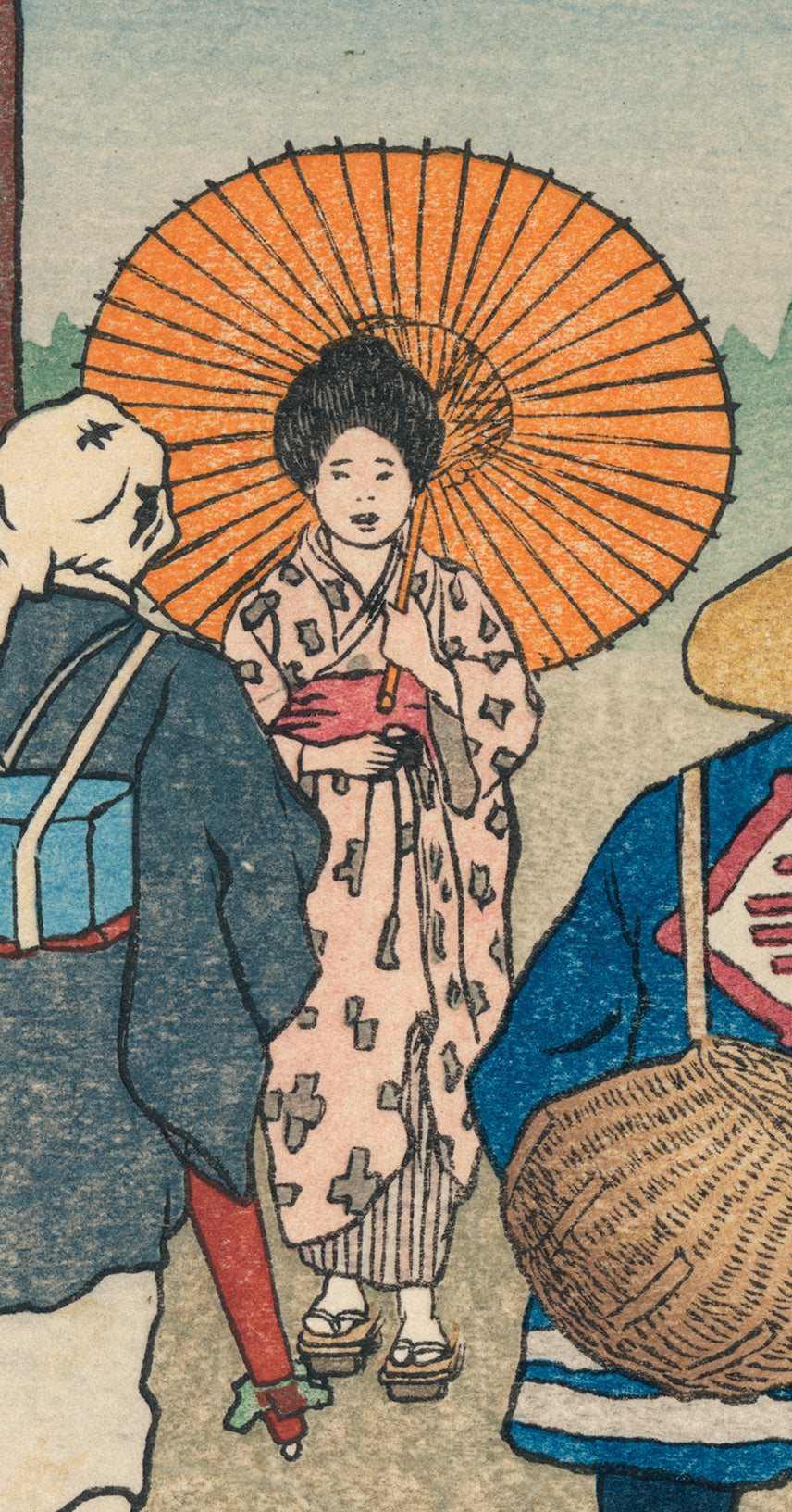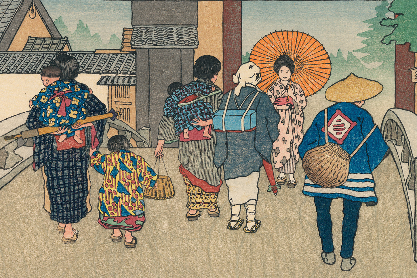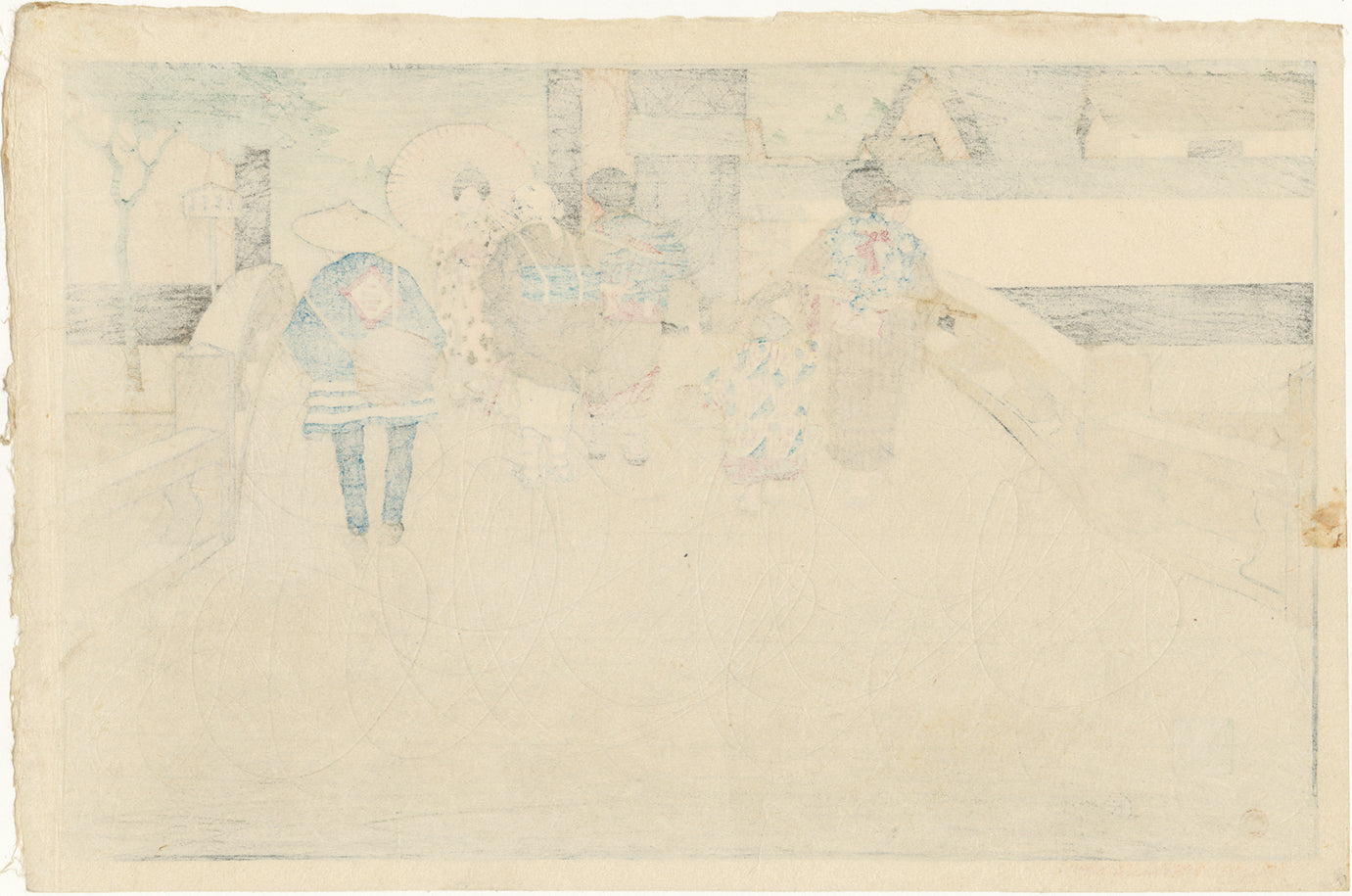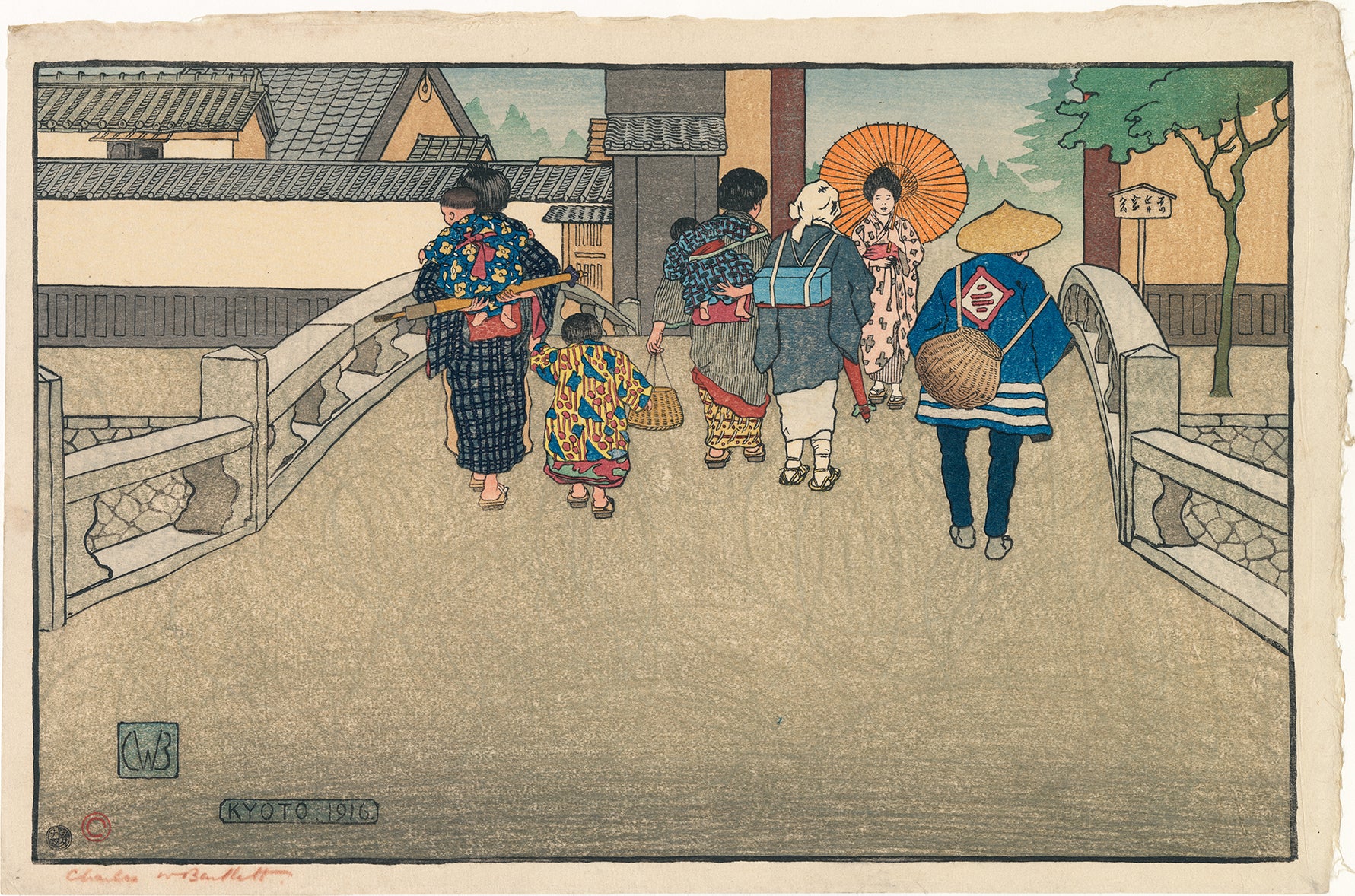 Taisho pedestrians cross a stone bridge in Kyoto, each one unique and based on keen observation. The artist has chosen an unusual viewpoint, as seven of the people have their backs to us, while only one woman, her bright orange parasol acting as a halo, approaches the viewer directly. Bartlett’s own pencil note on this design reads “No. 25/Kyoto Japan/ Pilgrims, peasants and Geisha girls. They cross the bridge––whither?” (A Printmaker in Paradise, page 118).