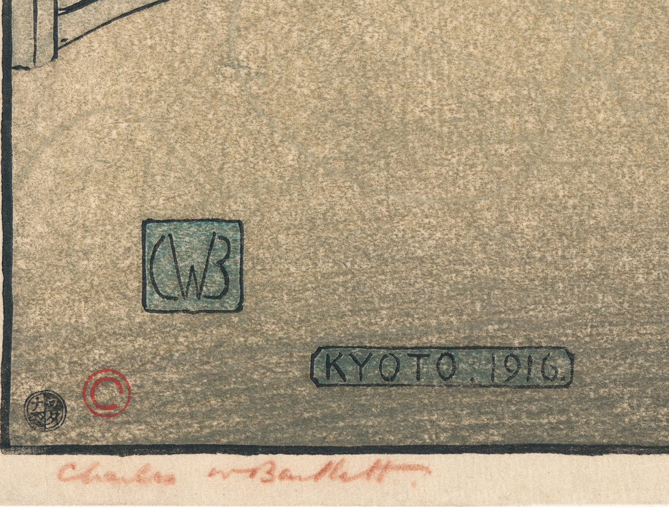 Published by Watanabe Shozaburo in 1916, as one of Bartlett's ten scenes of Japan. Signed in graphite, lower left margin, with "CWB" and "Kyoto 1916" inscribed in rectangles in lower left corner of print. Watanabe's early round seal is in lower left corner of print. A scarce, pre-earthquake design.