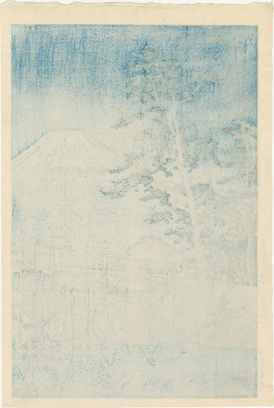 Picture-perfect evening scene of large conifers leaning almost protectively towards Mount Fuji, which rises with stately perfection in the distance. A wooden bridge is shown spanning the foreground, a man with a horse crossing towards the quiet village. As we often see in evening scenes, there are a few windows that beckon with bright glowing lights (here unfaded), giving warmth to the cool, aizuri blue of the moonlit night. When searching for this bridge today, there no longer seems to be a Kawai Bridge in this region, although there are postcards from around 1915 that show a very similar scene in the Chubu region of Japan with this small bridge named Kawaibashi. It is often the case that when looking for the exact places that Hasui chose to depict, that the names have changed and the location can no longer be easily found. This is more common when Hasui left the environs of Tokyo, as he may have titled places like small shrines using a more local, vernacular name; some small landmarks may also just have disappeared in the ensuing century. We can see Hasui’s original sketch of the scene in the 2013 Folk Museum of Ota City catalog, page 230. The sketch is dated Showa 8 (1933), 2nd month, so we can see that Hasui circled back to a place he had visited before the war. There are more than 70 sketchbooks that were donated to the museum by heirs of the artist, and the sketches are fascinating to study. With the round postwar Watanabe seal in red, lower right, consistent with a first edition.