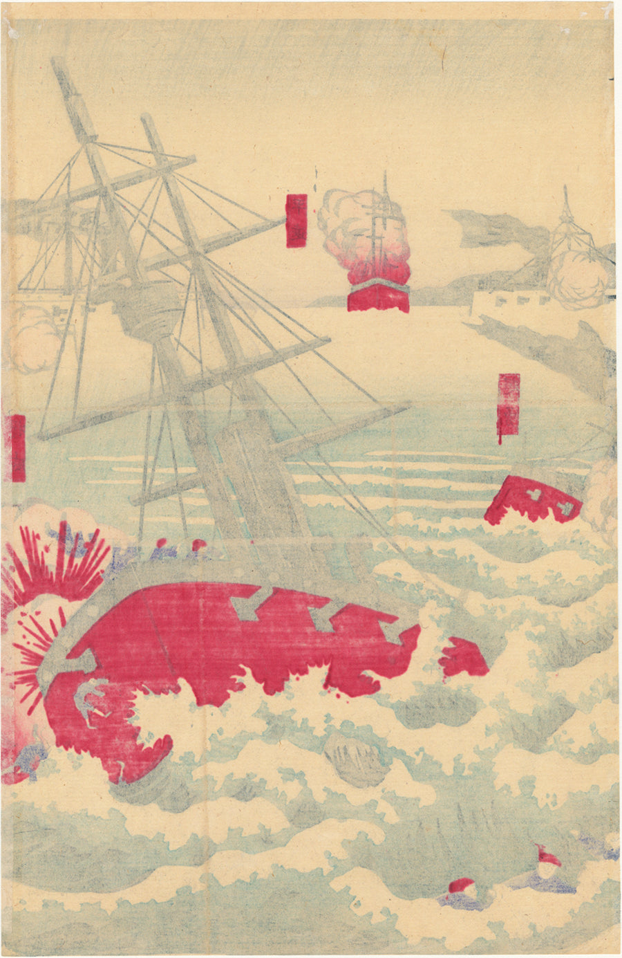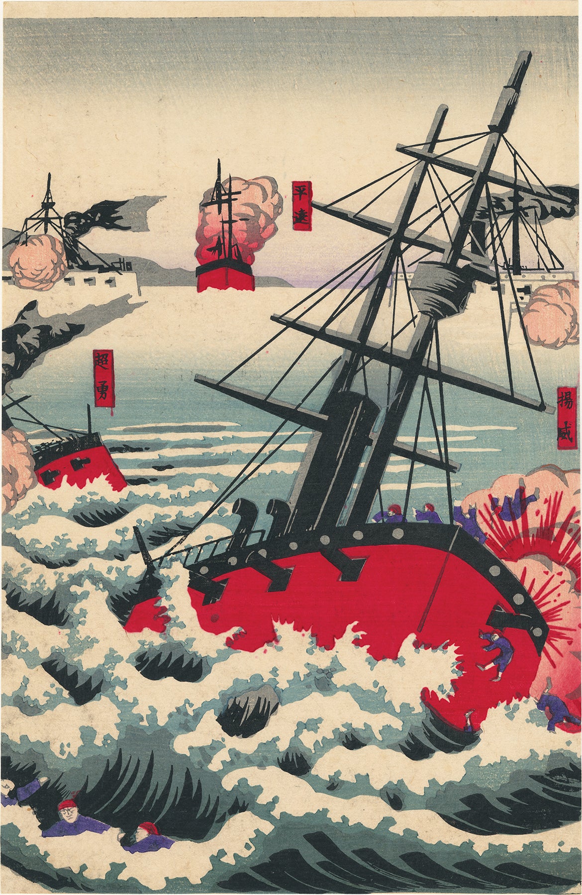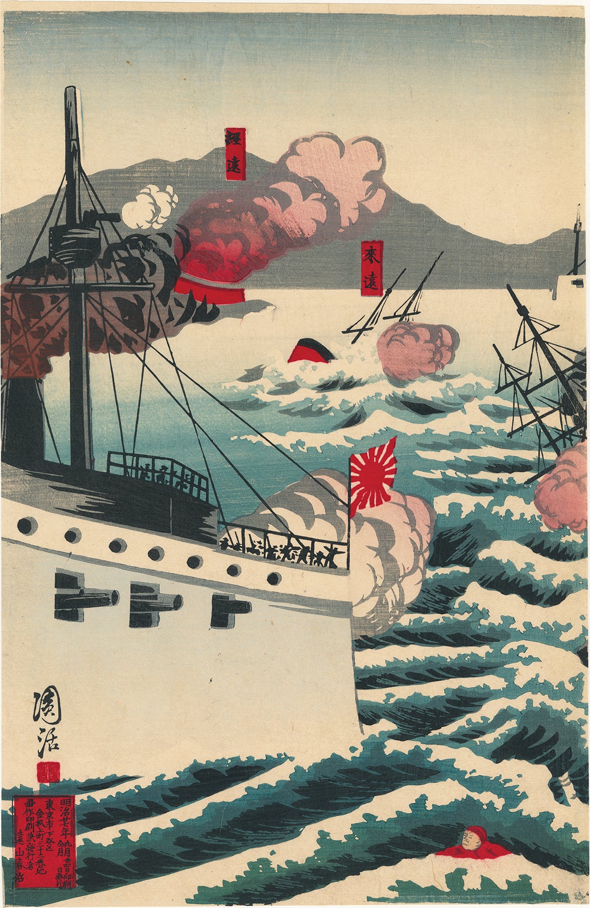 On September 17, 1894, the first large battle of the Sino-Japanese War was fought in the Yellow Sea, just outside of the mouth of the Yalu River, near the islands of Haiyang and Zhangzi. This battle is known as the Battle Off Dagu Mountain, the Battle of Yalu River, or the Battle of Haiyang Island. All of the ships are labeled with red cartouches, at least the ones that Japanese seem to have destroyed. This artist is unknown, and his style is somewhat unique in that there is not a traditional keyblock with outlines that create the scene. Instead, the feeling is almost of a cartoon, as the ships seem to lack proper scale. Swimming haplessly in the foreground are Chinese soldiers, and a few cling to the mast of their sinking vessel at right, a very sad sight.