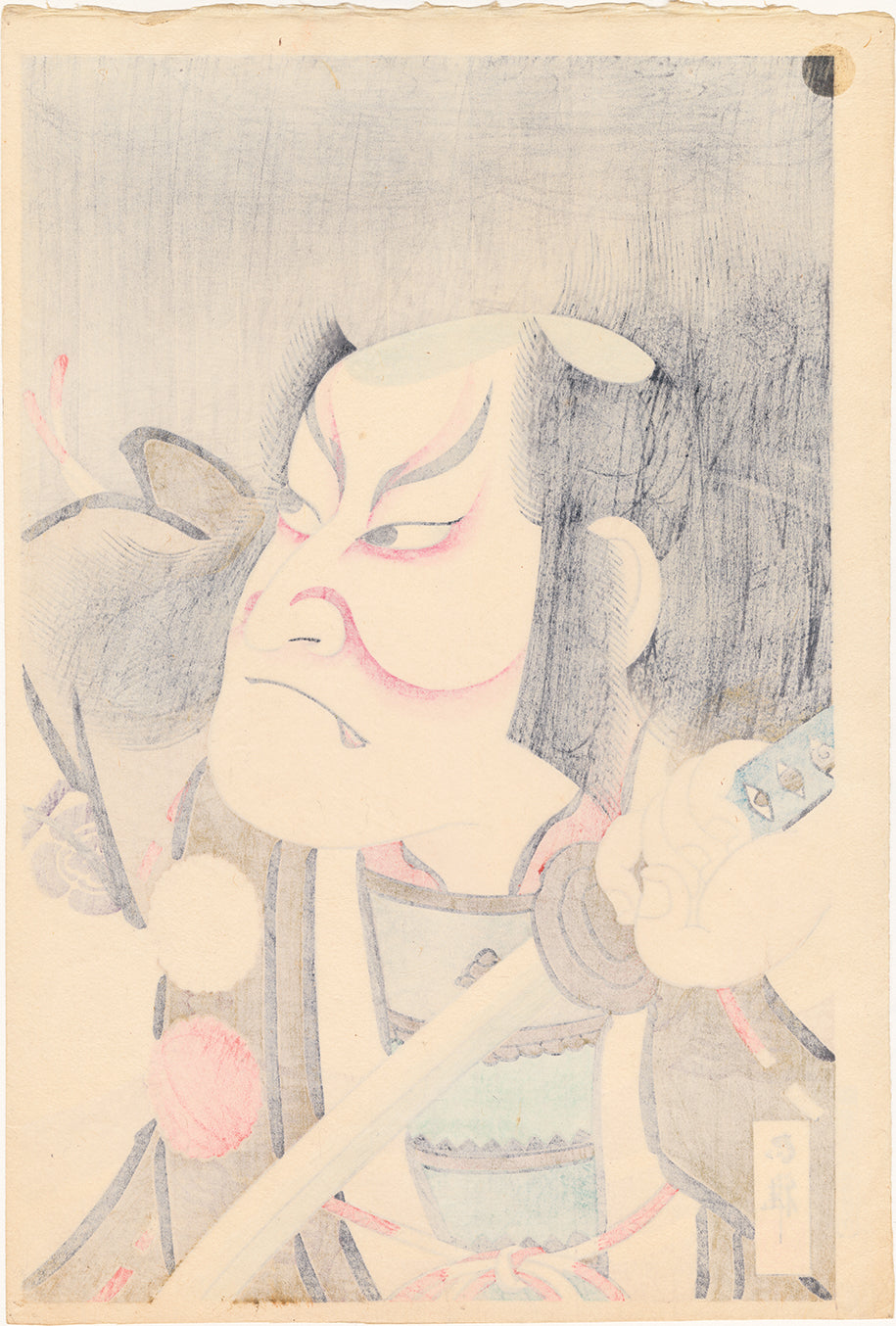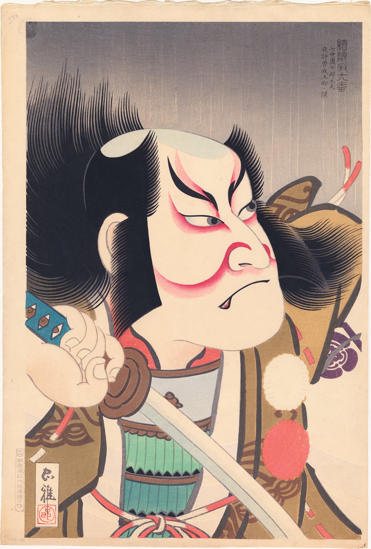 曽我五郎の隈化粧を施した歌舞伎役者。背後に雨が降り、刀を抜こうとしている姿で、顔には激しい決意の表情が浮かんでいる。赤は復讐への熱意を強調し、鬘は動いているかのように見える。衣装の二つの房飾りや顔の一部には盲刷りが施されている。曽我兄弟の物語を描いた歌舞伎は非常に有名で、1193年に若き二人が父の仇を討った話は、日本の三大仇討物語の一つに数えられている。