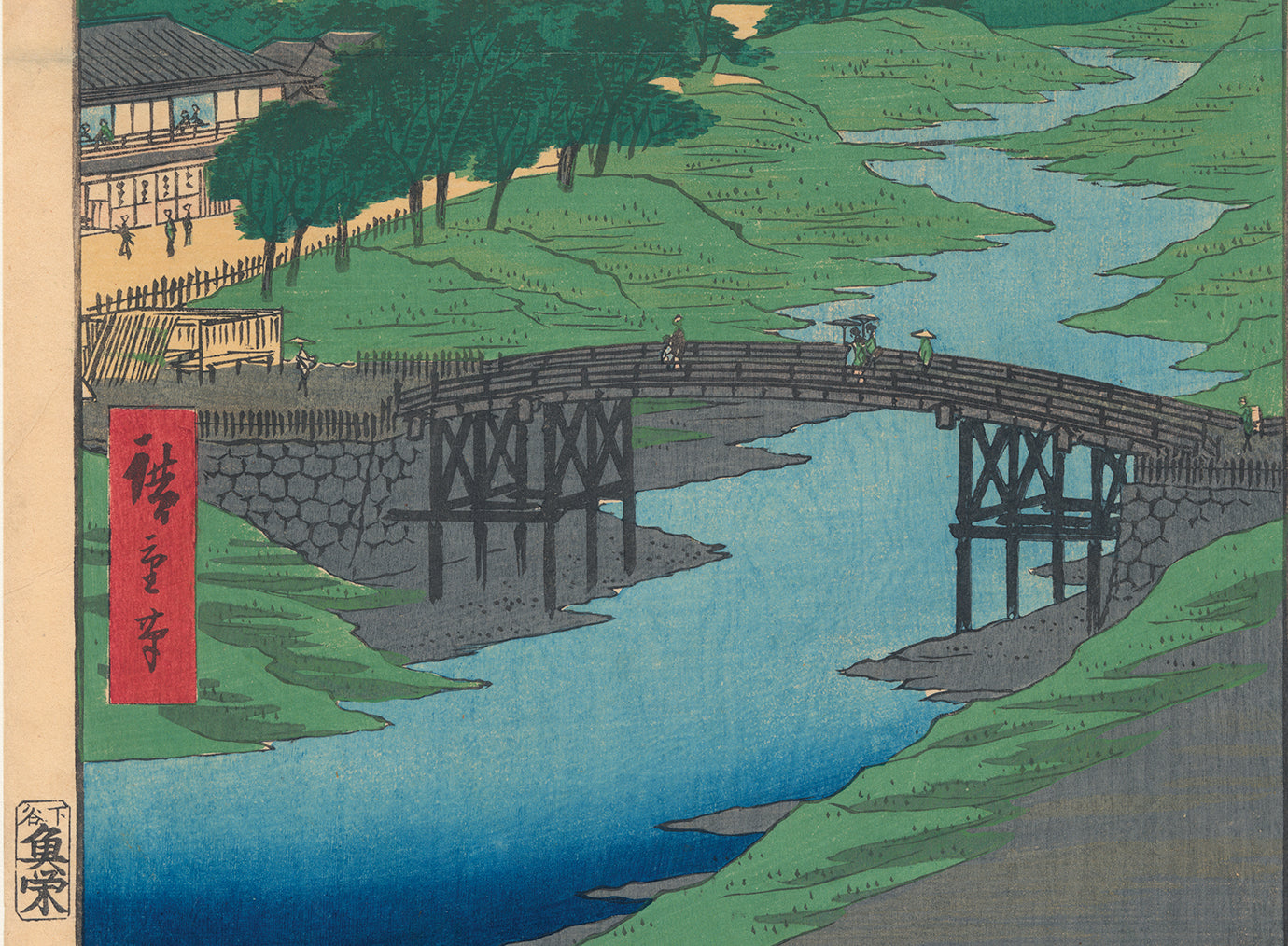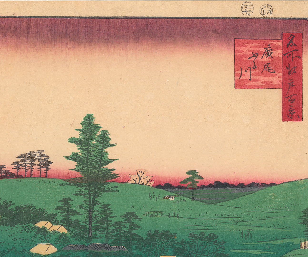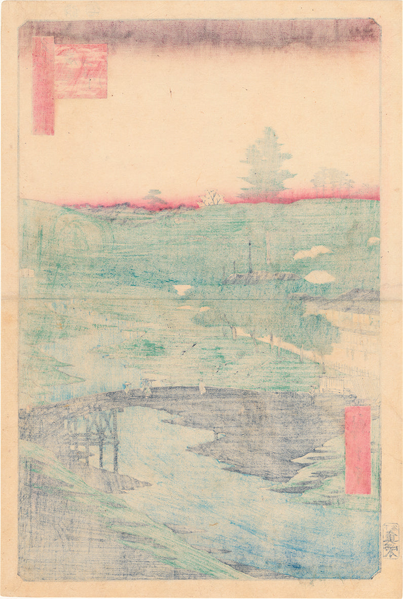 江戸南西部の広尾地域で、数人の歩行者が古川を渡っています。私たちの視点は渋谷方面の西向きで、右手に麻布の高台、左手に白金が見えます。この水路は現在、渋谷駅の下を通る水道橋を経て、高架道路の下の水路を通る地下水路となっています。しかしヘンリー・スミスによれば、広重の時代でさえ、この地域にはこの牧歌的な景色が示す以上に多くの寺院や住宅があったそうです。左側に見えるのはこの作品の有名な構図で、当時非常に人気のあった鰻屋「尾張屋」で、当時の知識ある人々にはよく知られていました。