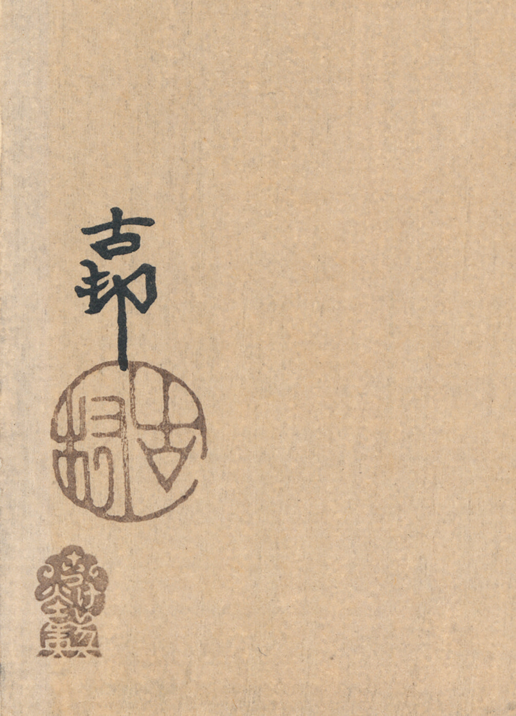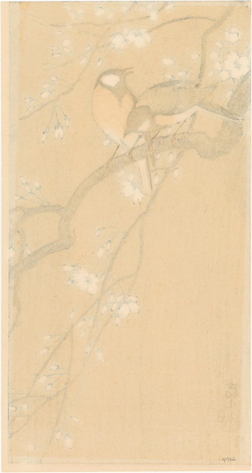 二羽の色鮮やかな鳥が咲き誇る桜の枝にとまっています。非常に活発な様子で、一羽は歌っているようにも見えます。カタログ・レゾネではシジュウカラとされていますが、バーディングの専門家ニック・ハマタケ氏によると、日本にはシジュウカラは生息しておらず、こちらはヤマガラの可能性が高いとのことです。また、古邨は意図的に五色の異なる色を鳥に描いており、これは類似種の中でヤマガラを識別する特徴の一つだと指摘しています。国桂堂から出版されたこのような作品は、作家の初期の版画の一部であり、明治時代に出版されたものもあります。このデザインは希少で、博物館所蔵例はオランダのアムステルダム国立美術館にあるものだけのようです。初版かつ唯一の版です。