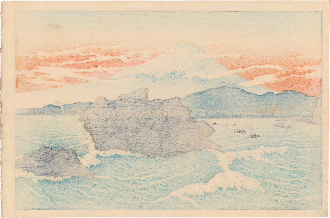 私たちの視点は、海から岸に打ち寄せる波の上に浮かんでいるようです。富士山は鮮やかなオレンジ色の空を背景にそびえ立ち、周囲には雲が漂っています。前景には砕ける波と二つの大きな岩が見え、背景には帆船が浮かんでいます。この版画の独特で多様な質感が際立っており、空にはオレンジ色の層があり、海には多くの小さな波紋があります。中景には小さな山々の連なりが見えます。興津は東海道五十三次の十七番目の宿場で、江戸時代の多くの浮世絵師、特に広重に好まれた題材です。
