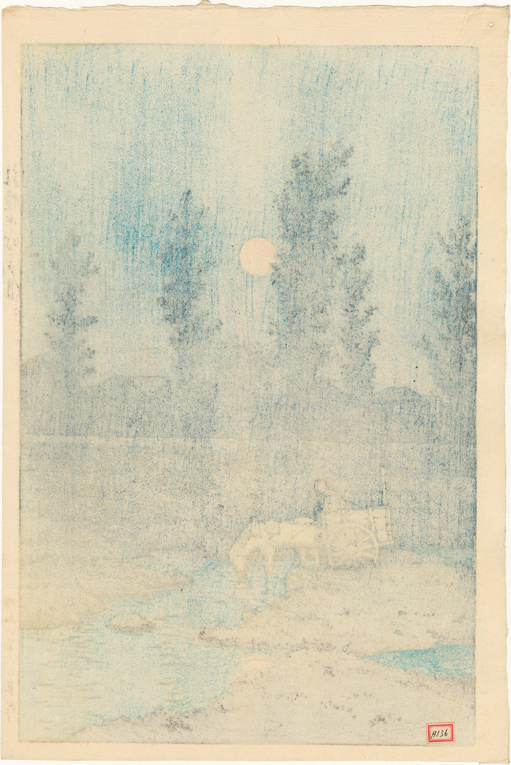 Unlit except for a full moon, we see a farmer watering his horse on his way home from the fields. Nakanoshima is situated in southern Sapporo on the northern island of Hokkaidô. Tall poplar trees, for which Sapporo is known, soar in the darkness. Behind them the red-orange moon hangs deep and reflects on the water. With this incredibly evocative design, Hasui transports us, giving us an intimate glimpse at a long-lost place and time in his beloved countryside. With deep purple on the horizon and woodgrain in the sky, this may be considered a first edition, with the Watanabe seal used between 1930 and 1942.
