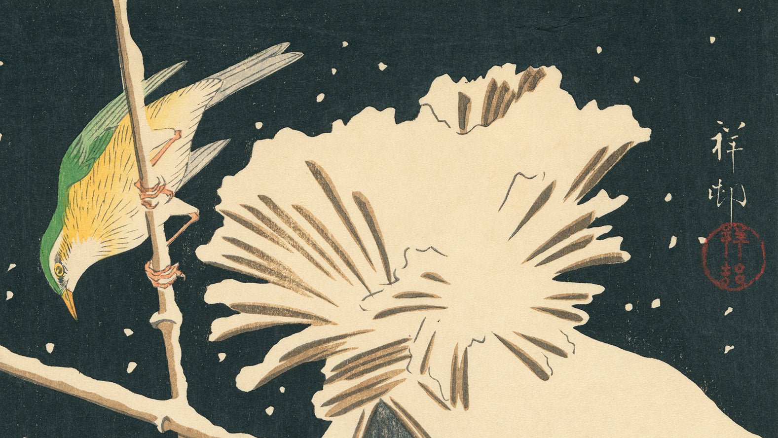 Dramatic design of a brightly colored green and yellow Japanese bush warbler perching against a deep black winter sky. Although this bird is identified as a Siberian Bluechat by Newland/Perrée/Schaap, the bluechat has a deep blue coloration above that this one lacks. In the 1936 Watanabe catalog (number O34), it is identified as a Japanese Nightingale, today called a Japanese bush warbler. The Japanese bush warbler (Horornis diphone) is olive brown above and may have a soft yellow below. Its head and leg coloration do look closer those seen on this Koson design. With thanks to Nick Hamatake, who kindly offered his expert birding eye to confirm that this is most likely a Japanese bush warbler due to a number of identifying features, including even the shape of the bird's bill and the season of winter/early spring. He also noted a centuries-old poetic association as this bird as an early harbinger of spring.
