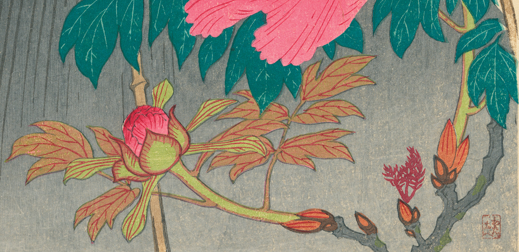 In any case, this print features a lovely bird peering down from its perch on a snow-covered twig on a protective tentlike shelter that has been erected for an enormous red peony that is blooming despite the elements. The white snow contrasts dramatically with the jet black background, and the deep color of the flower beckons as invitingly as a warm spring morning. This is sourced from a collection of works that were assembled in Japan before WWII and were never framed. With the Watanabe “Wa-ta-na-be” personal seal, lower right, often referred to as a “gift” seal. From the paper and the printing, this dealer would judge this to be a prewar printing. There are also no postwar Watanabe seals on the work. A very scarce design that almost never appears on the market. Due to its rarity and lack of postwar reprints, it is probable that the blocks for this design were destroyed during the war.