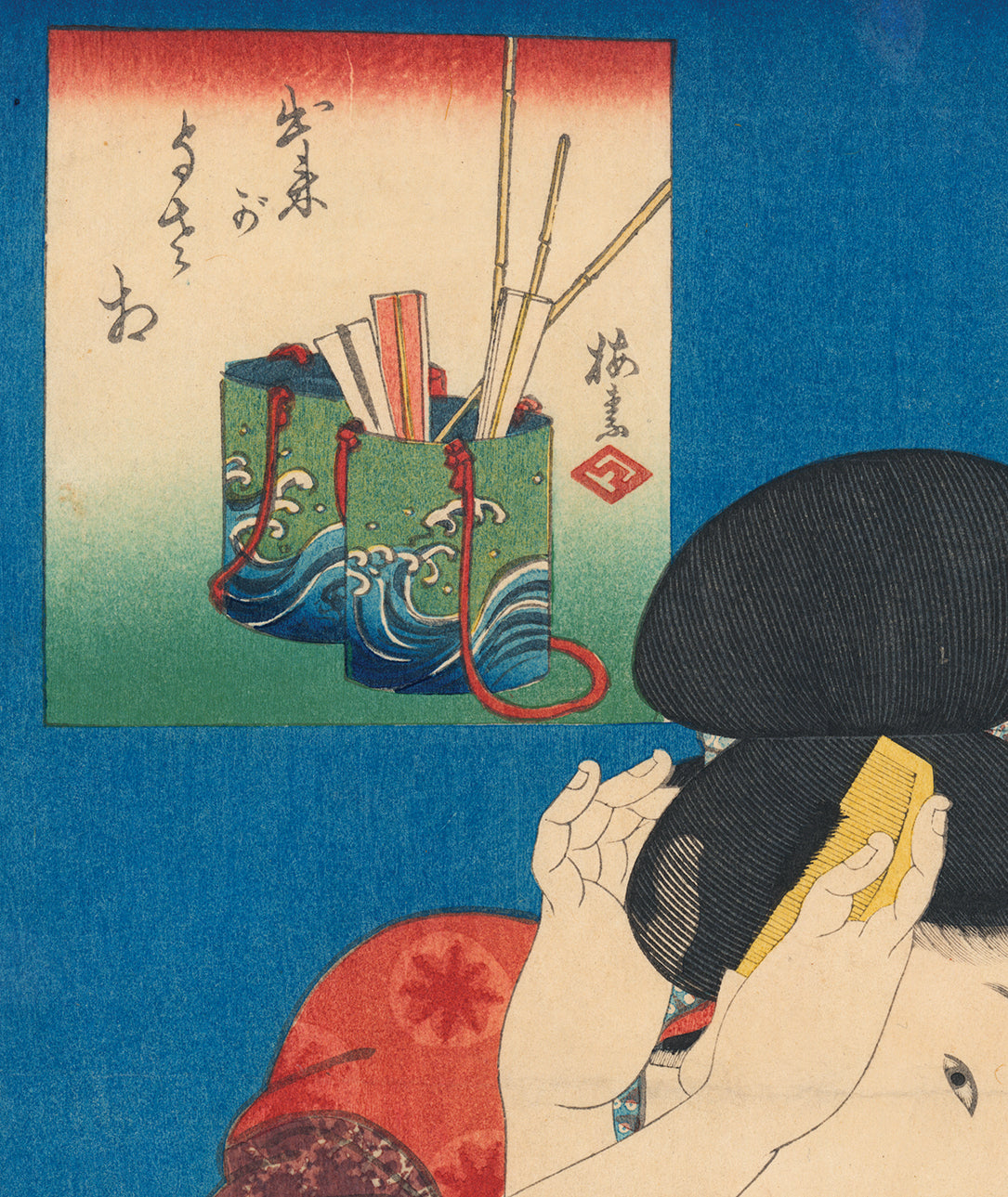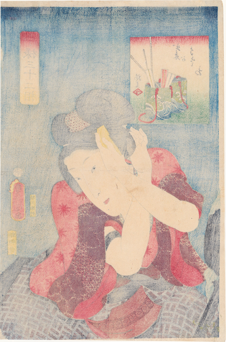 A woman sits before her mirror and uses both hands to perfect her coiffure. She careful runs a comb through one of the side sweeps to her elaborate updo. Her left hand may be seen through the strands of her black hair, a testament to the luxurious and perfected printing of this series. Her outer robe has been shrugged off, and we see a black armband on her upper arm. This may be covering up a tattoo, or it may simply be a good-luck token from a shrine. The inset shows two containers holding sticks and folded papers; they have the patterns of cresting waves. The inset design done by the artist Miyagi Gengyo (1817-1861). Kunisada was flexing his muscles as the most popular ukiyo-e artist of the time, as this and other series of the period feature absolutely dazzling printing techniques. Here the black edges of her robe and the mirror feature burnishing, and the woman’s hairline features carving that is as fine as a single hair.