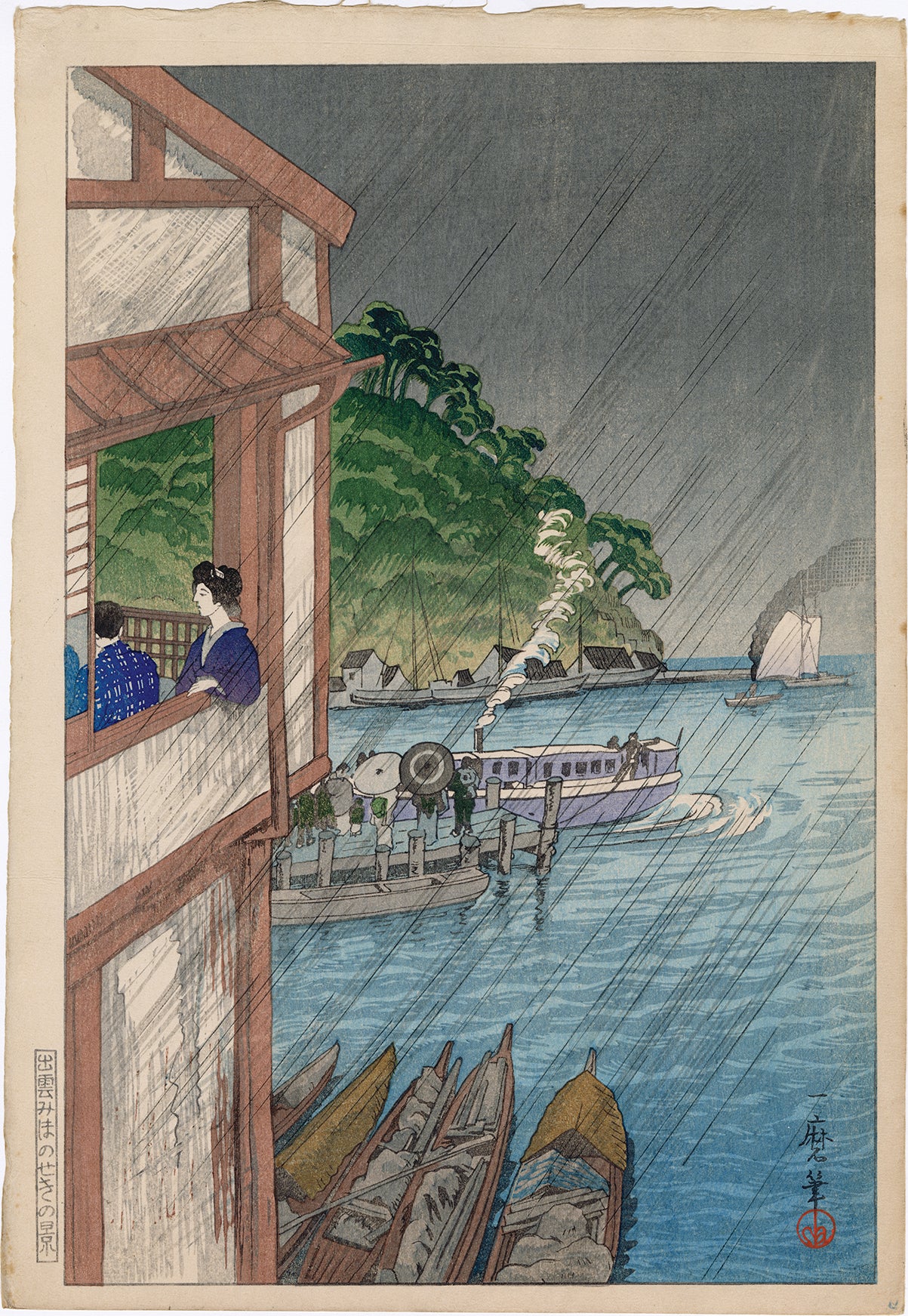 A woman and her companion are seen at ease through the window of a restaurant upper left, and we also get to enjoy their view of the harbor. Rain falls in diagonal lines across our view. On the water are some old-fashioned wooden boats, and at the dock we see a motorized vessel that must be a ferry, its smokestack emitting plumes of white exhaust. Folks are lined up on the dock. To the right is a sailboat as well as another motorized vessel, its smoke plume ending in an interesting array of crosshatching. Titled “Izumo mihonoseki no kei”, lower left, in margin. The port town of Mihonoseki in Matsue features this small, historic harbor, which flourished during the Edo period. It still looks largely the same today as it did in this view from one hundred years ago. It is still surrounded by an abundance of nature and offers a wonderful view of Mount Daisen. Its main feature is the Miho Shrine, the main shrine to Ebisu, the god of fishermen.